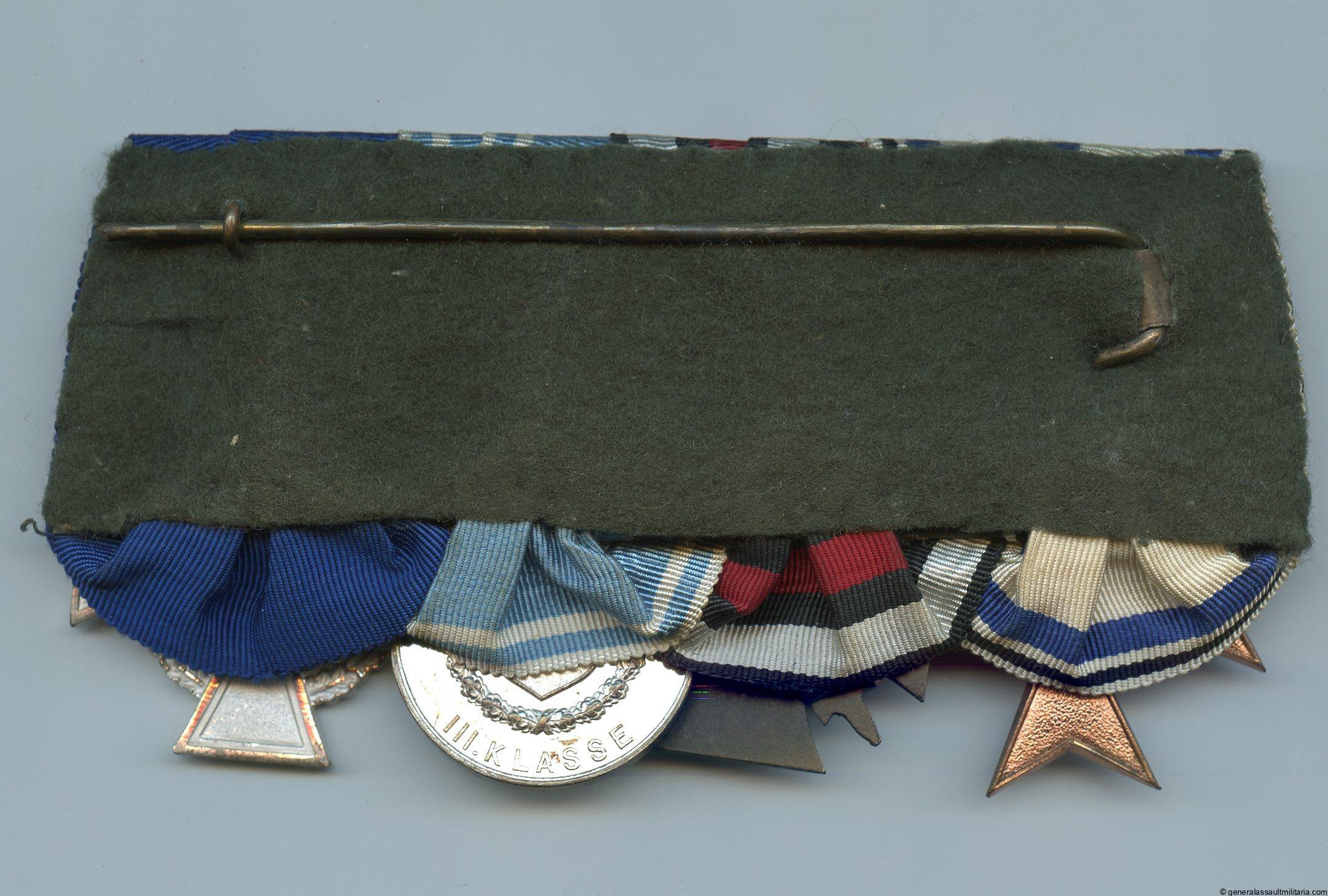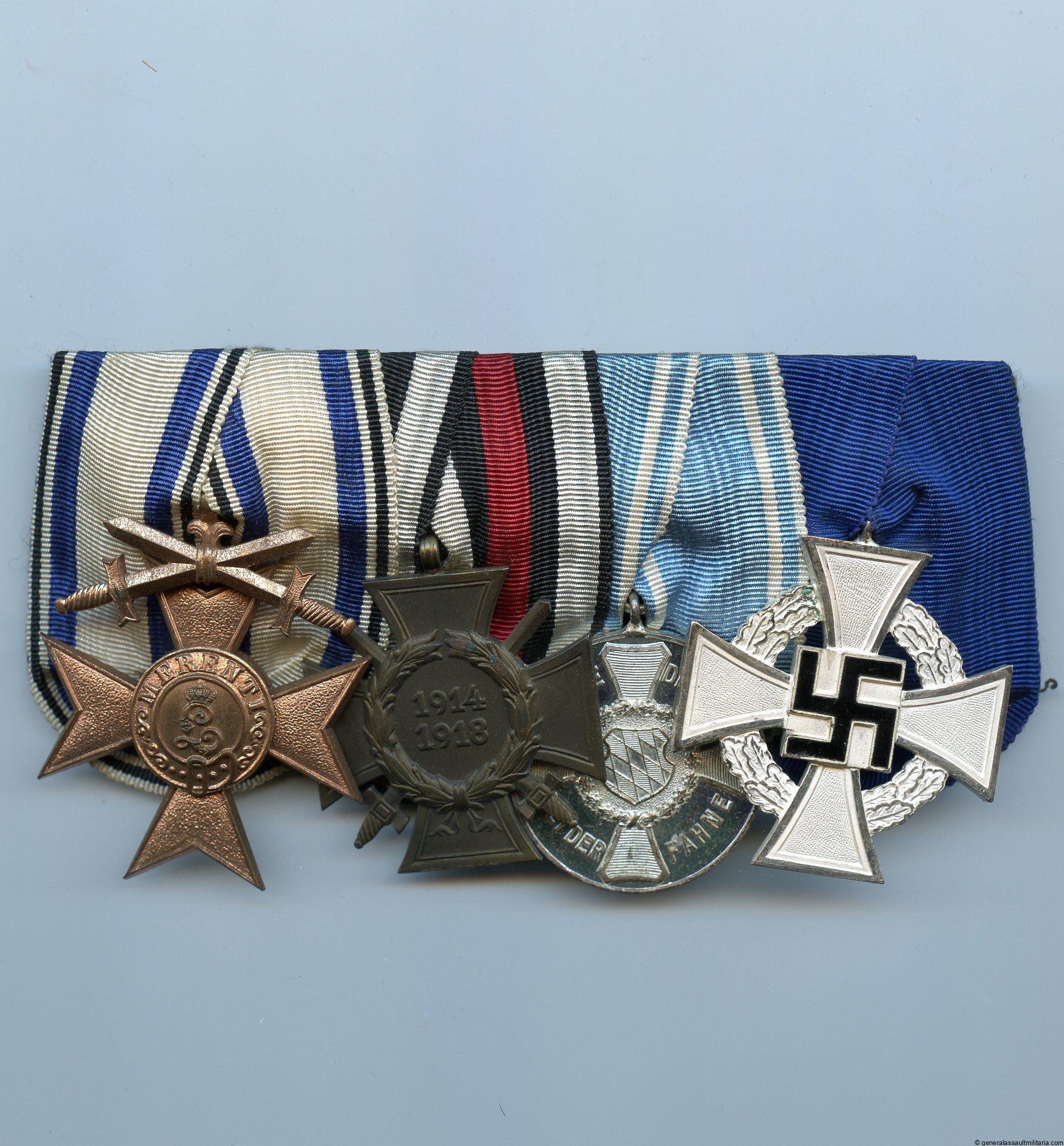 4 piece medal bar in near mint condition. Shows the 3th class Bavarian Merenti medal with swords, Frontkämpfer with swords, True dienst bei der Fahne and 25 year loyal service medal. Remain in excellent condition and are nicely mounted.