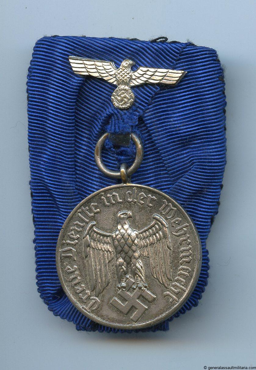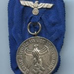 4 year service medal single mounted. Steel medal in worn condition and partially faded/patinated finish. Single mounted to a medal bar and ribbon eagle on top. Ribbon is slightly damaged near the attachment ring and might have a replaced medal.