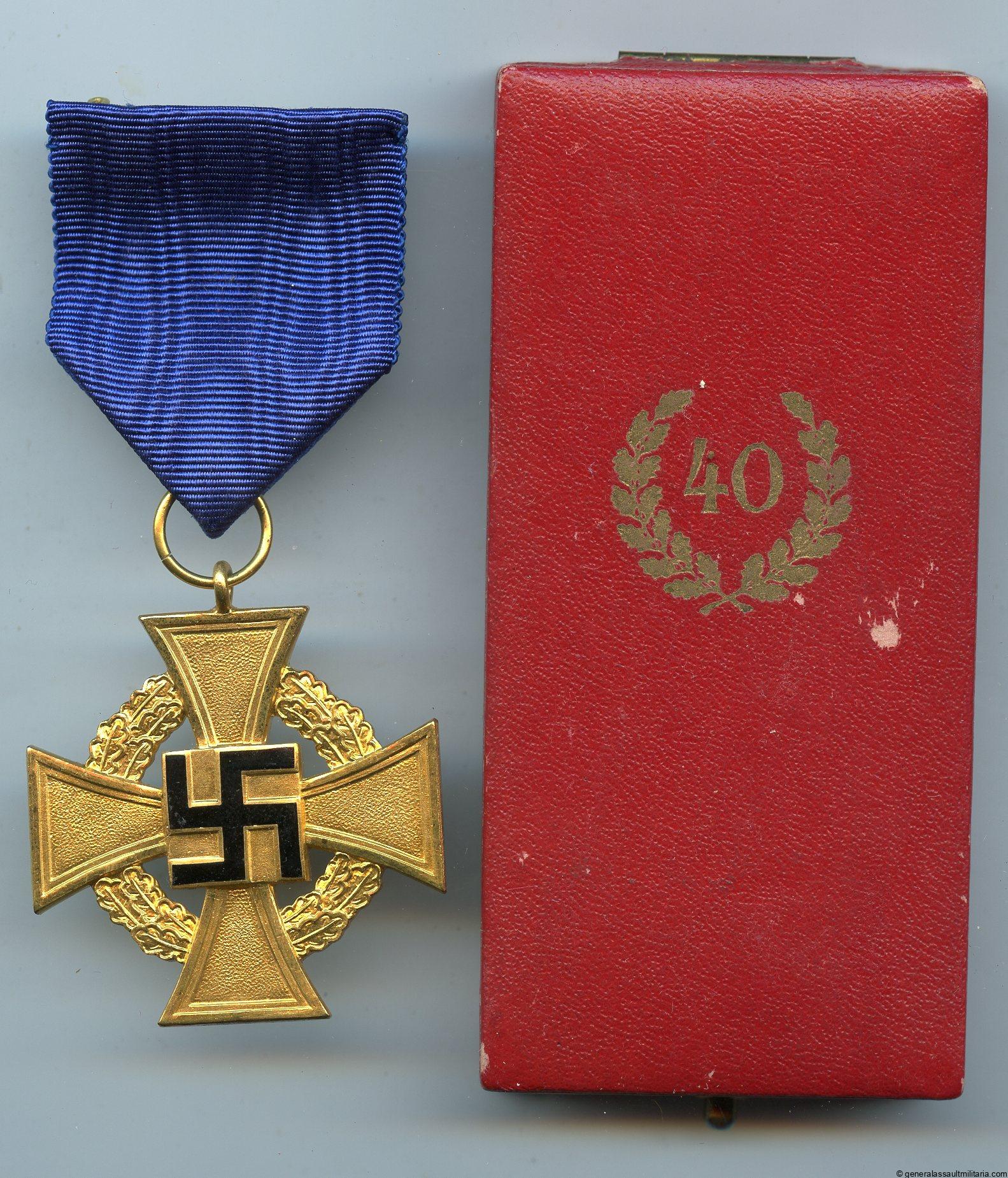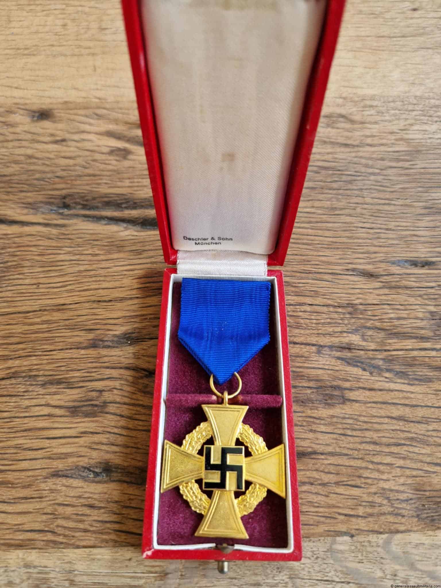 40 year service medal cased – Deschler & Sohn, München. Early war tombac medal with gilded finish and enamel inlay. Comes with matching Deschler marked case. Medal remains in mint condition and the matching case shows slight wear. Good set.