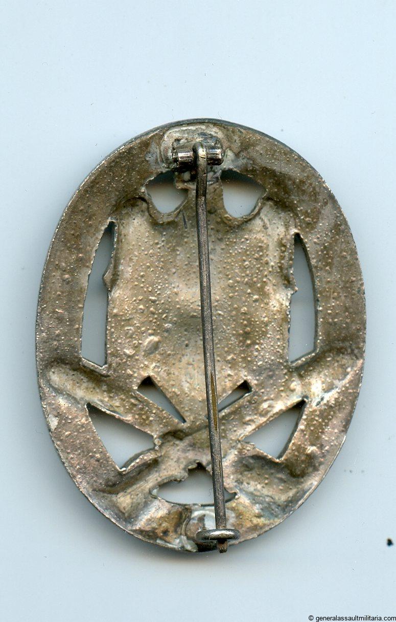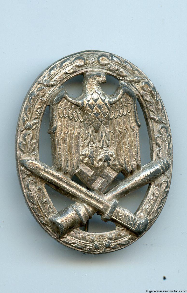 General assault badge – Rudolf Karneth, Gablonz. Mid to late war zinc badge with crimped in ball hinge and catch. Remains in nicely worn condition and has retained the finish well on the unworn areas. Very well preserved RK GAB.