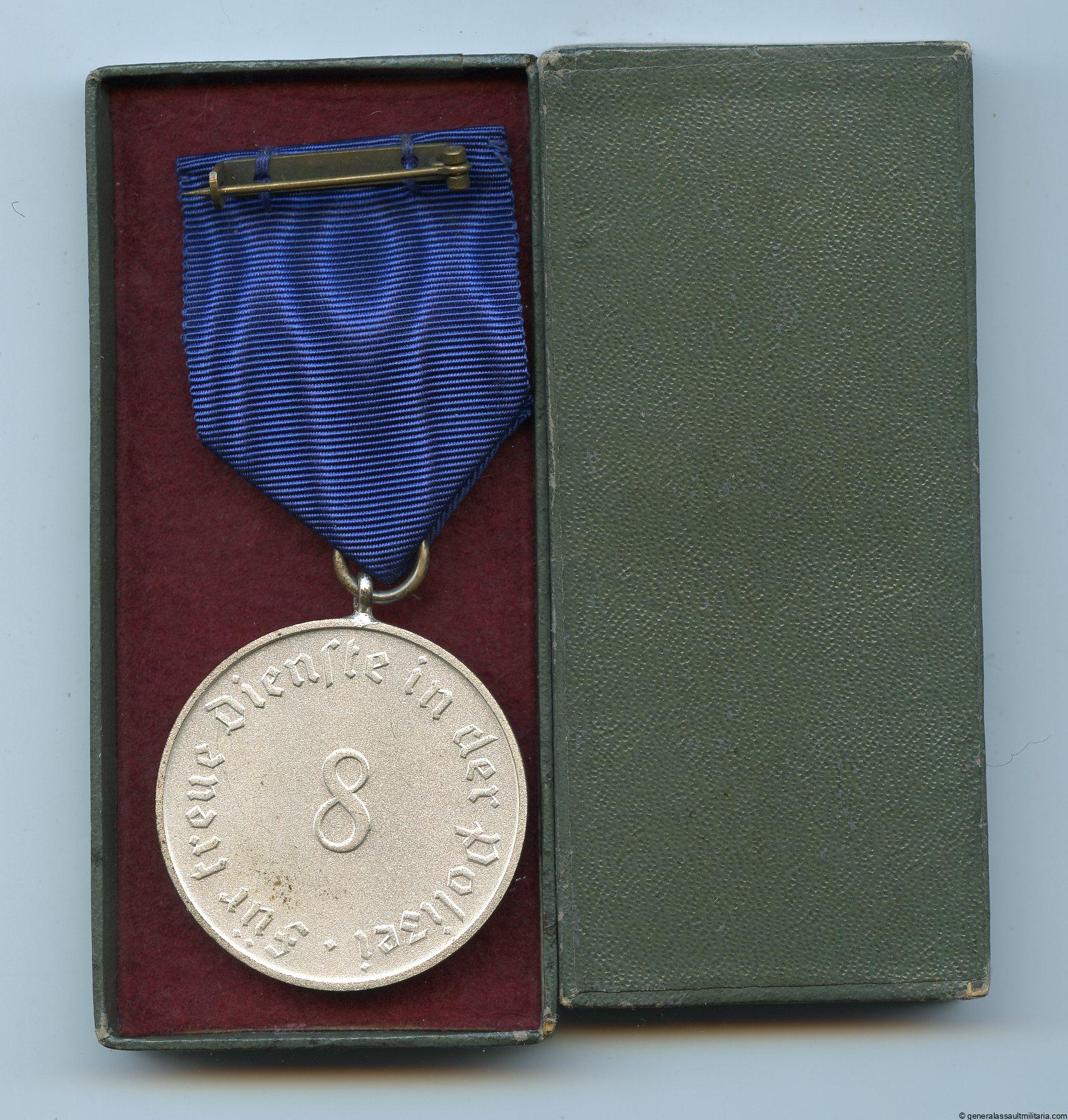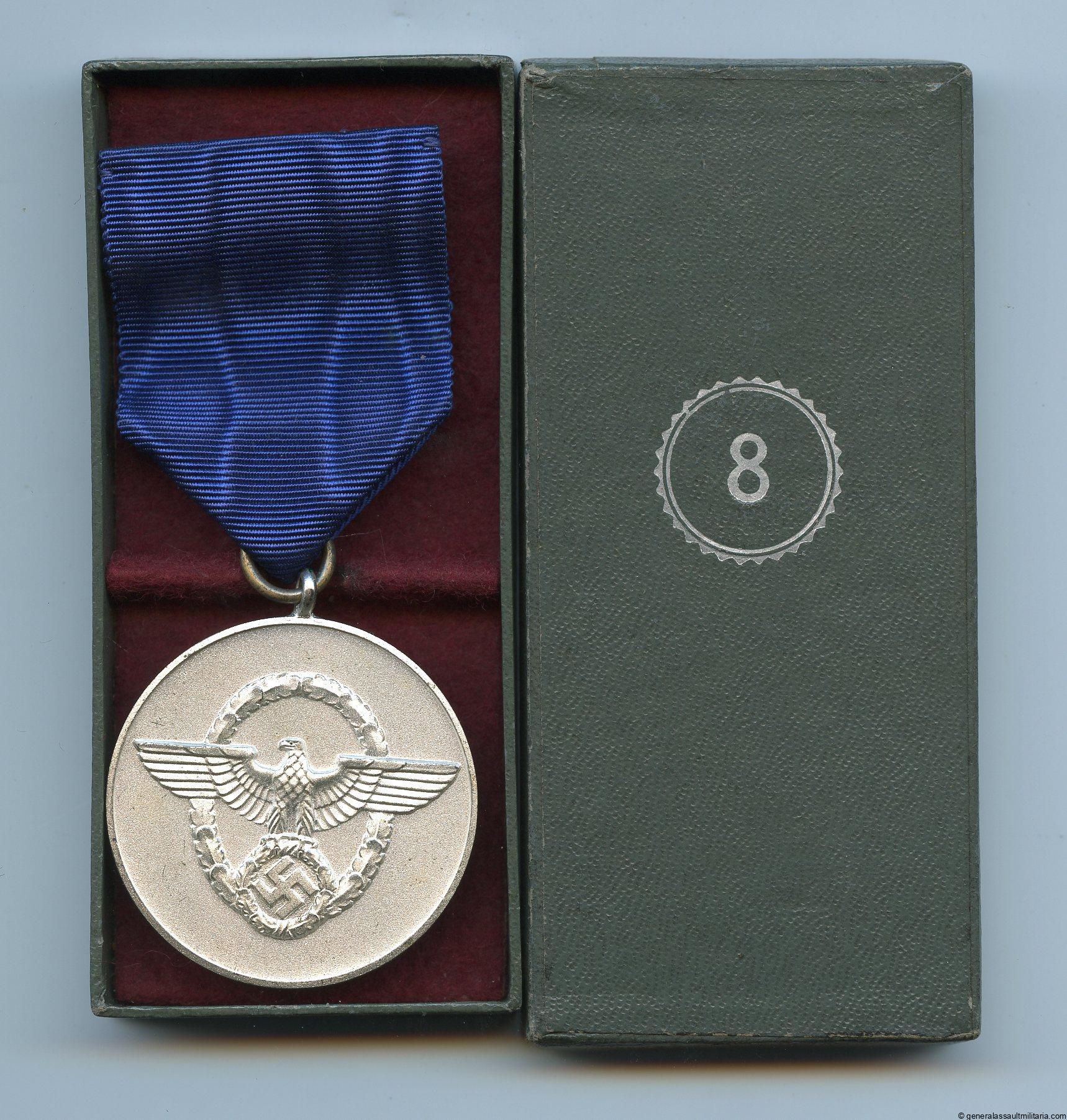 8 year police service medal. Tombac medal with silver plated surface and attached ribbon with setup device. Remains in excellent mint unworn condition and comes with matching case in equally fine condition. Perfect set.