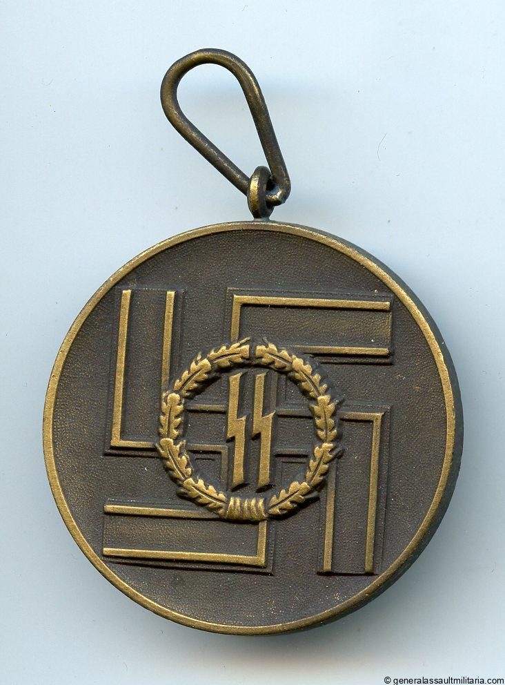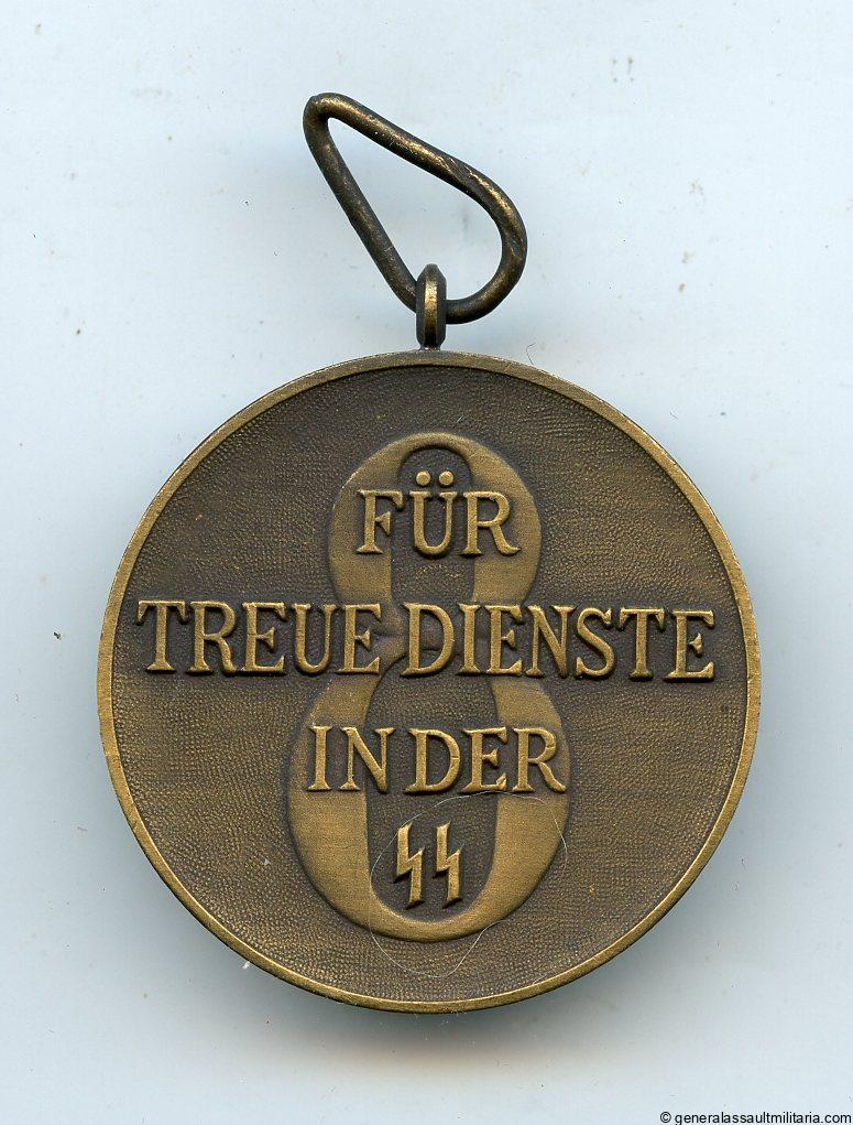 8 year SS loyal service medal – Type II. Tombac service medal with type II design and dark bronze finish. Remains in excellent mint condition with all the bronze finish present and no sign of wear. One of the very few awards that was intended for the SS only. Top example and has no standard blue service ribbon present.