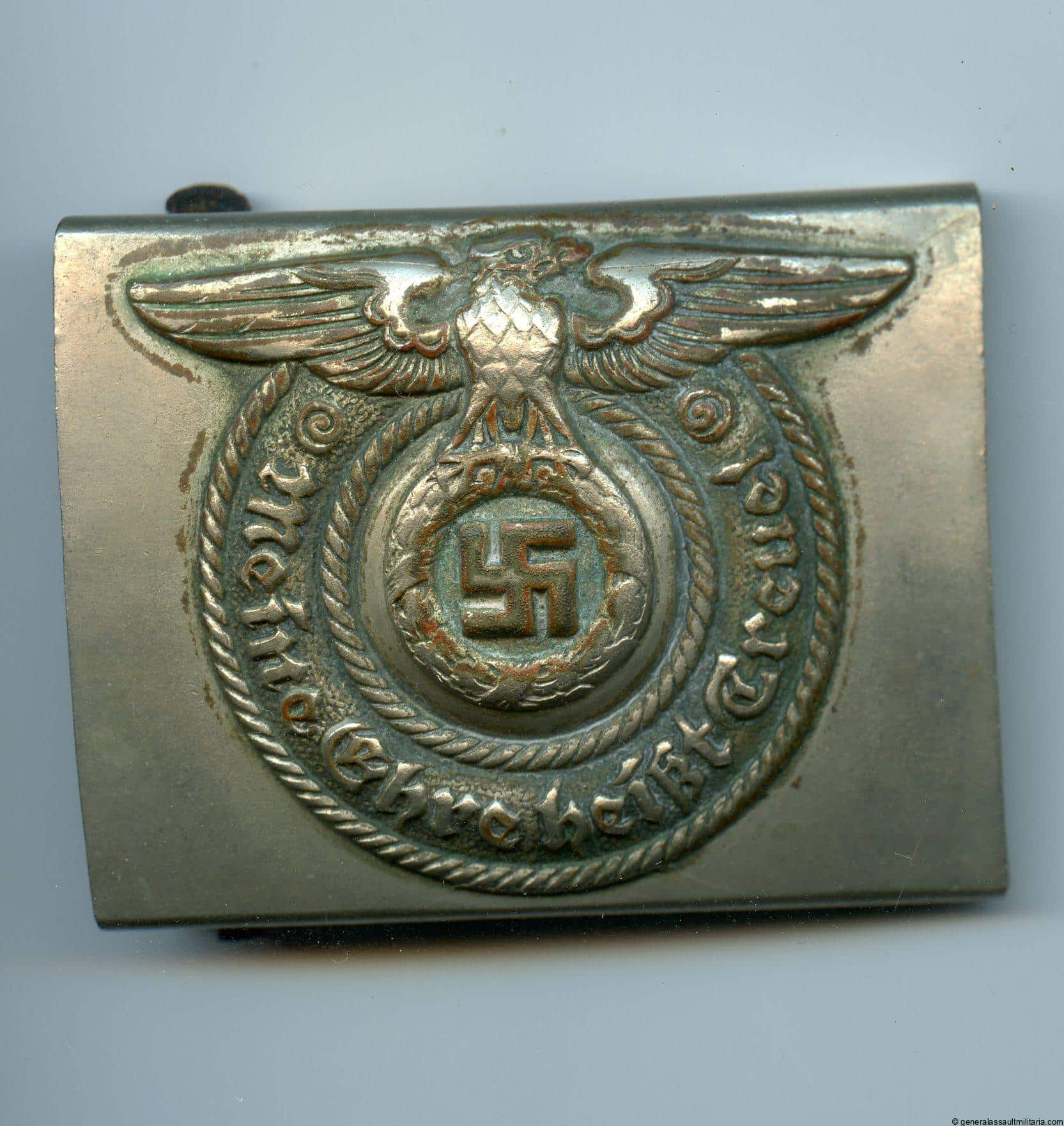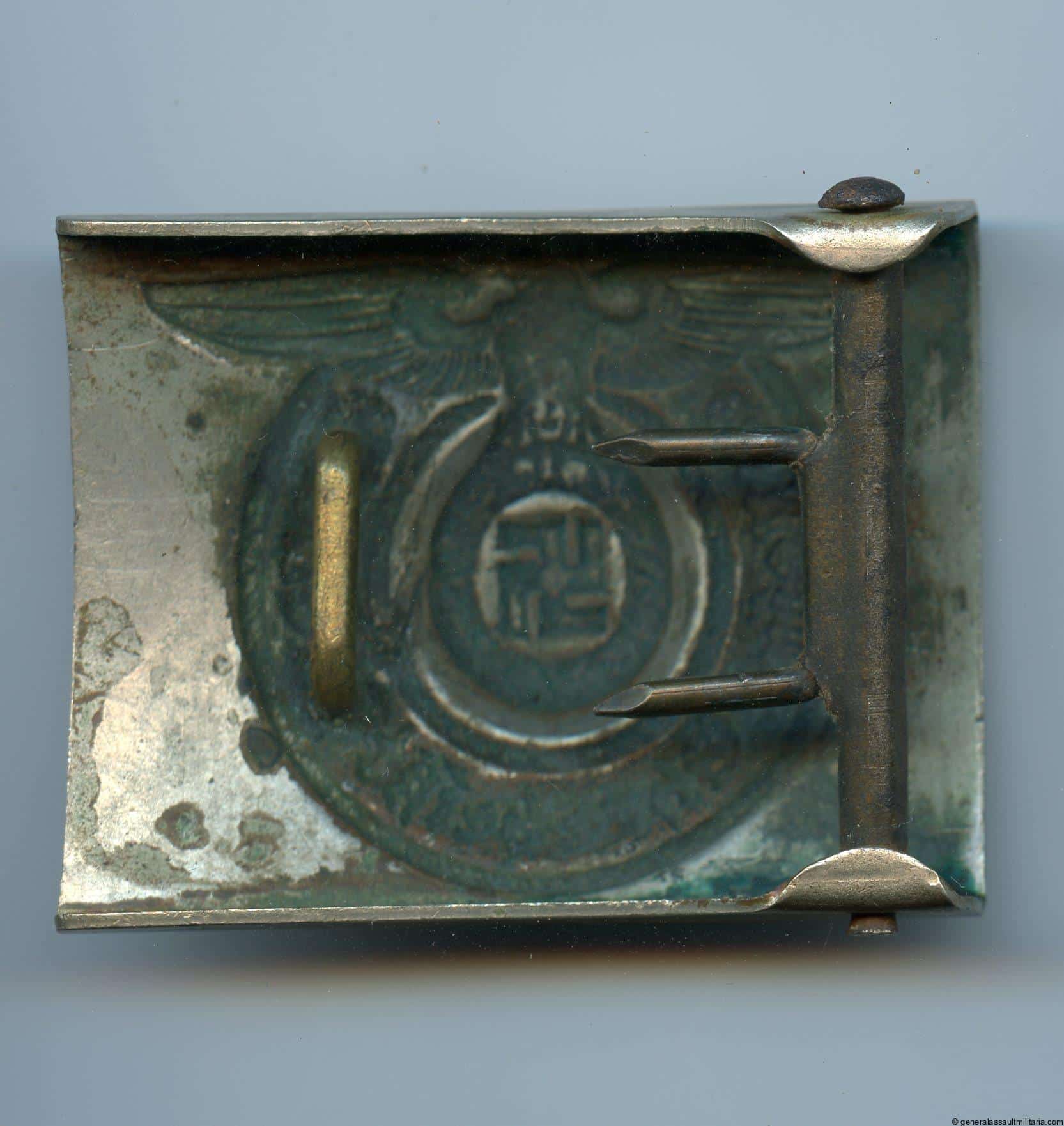 Allgemeine SS/SS-VT buckle – Cracked wing. Very uncommon nickel silver construction early 30s buckle with the cracked wing design. Remains in good worn condition with a reddish patina on the worn parts and some green patina on the reverse. Sought after and difficult to find SS buckle.