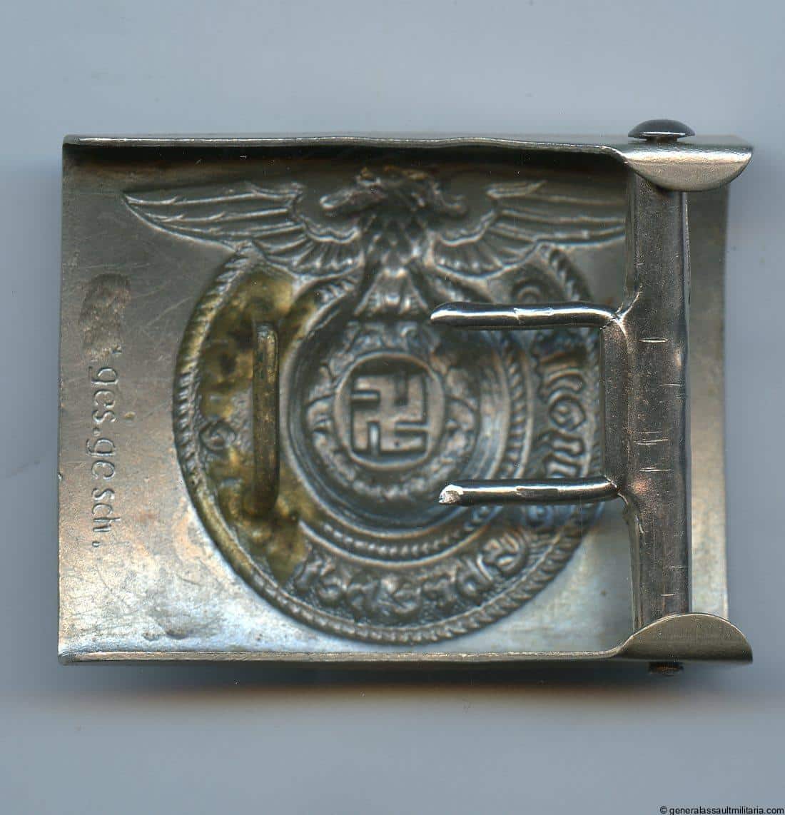 Allgemeine SS/SS-VT buckle – Overhoff & Cie, Lüdenscheid. Early 1930s SS buckle from Nickel silver construction,with frosted surface and Ges. Gesch. mark. Has the factory removed O&C mark on the reverse and is considered to be a special variant by collectors. Remains in perfect near mint to mint condition showing all the frosting on the front. Stunning Overhoff buckle.