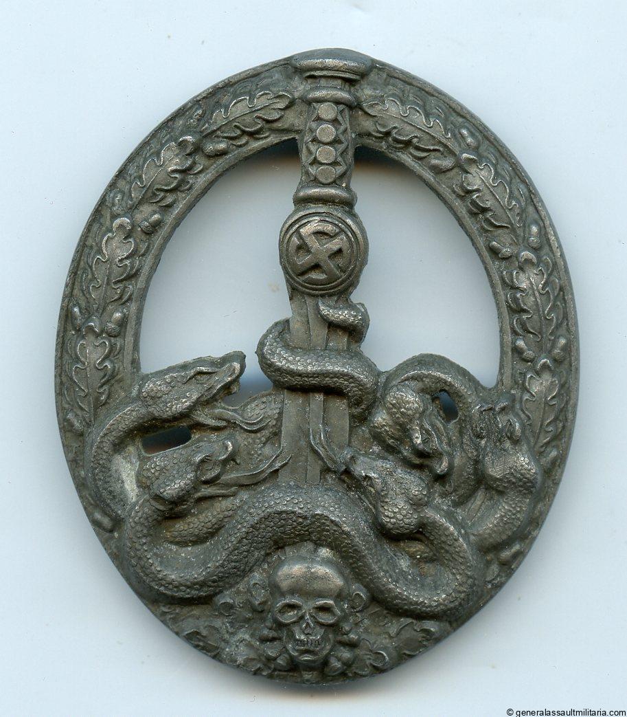Anti partisan badge in bronze – C.E. Juncker, Berlin. Semi hollow zinc ‘Bandenkampfabzeichen’ with Juncker design and 3 cut outs near the snakes. Earlier example with the tonne hinge and thin pin. Remains in very lightly worn condition, based on the slight sharpening of the bottom of the pin this one appears to be a worn example. The finish has typically faded for the most part and only shows some remanent on the setup. Beautiful example without any of the cracks seen on most Junckers!