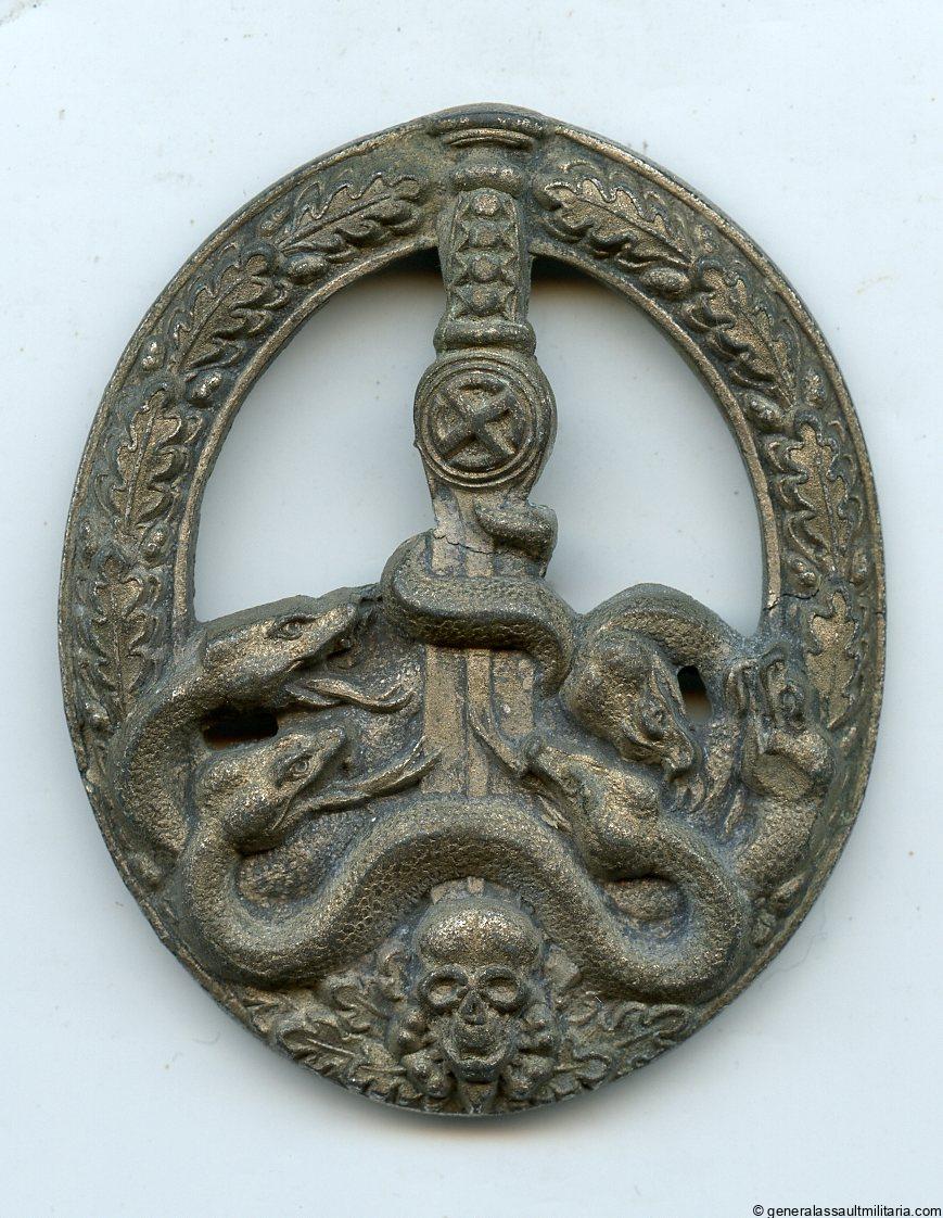 Anti Partisan badge in silver – C.E. Juncker, Berlin. Mid to late war semi hollow zinc ‘ Bandenkampfabzeichen in Silber’ With wide pin setup and thick silver plated finish. Remains in nicely preserved condition with most of the finish still present and only light signs of possible wear. Has a typical crack on one side of the wreath going fully through, but no separation of the two parts. Very common to observe these cracks on APB. Excellent silver example!