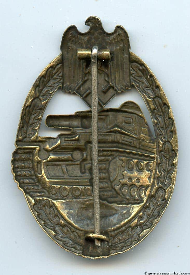 Panzer assault badge in bronze – Otto Schickle, Pforzheim. Early hollow tombac Schickle design PAB with machine milled C catch. Remains in worn condition with some of the finish remaining and a patina spot on the left side. Very good looking early bronze PAB with some wear.