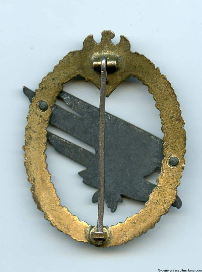 Army paratrooper badge – Friedrich Linden, Lüdenscheid. Mid war zinc ‘Heeres Fallschirmschützenabzeichen’ intended to be worn by army or SS paratroopers, often attached to the Brandenburg unit. This earlier zinc version shows the high quality burn lacquer gilding in nearly perfect condition and has the rarely encountered block hinge. The eagles silver finish patinated into a greyish appearance, leaving a good contrast with the still beautiful wreath. Stunning example of a rare FLL Heer para variant that would be hard to upgrade!