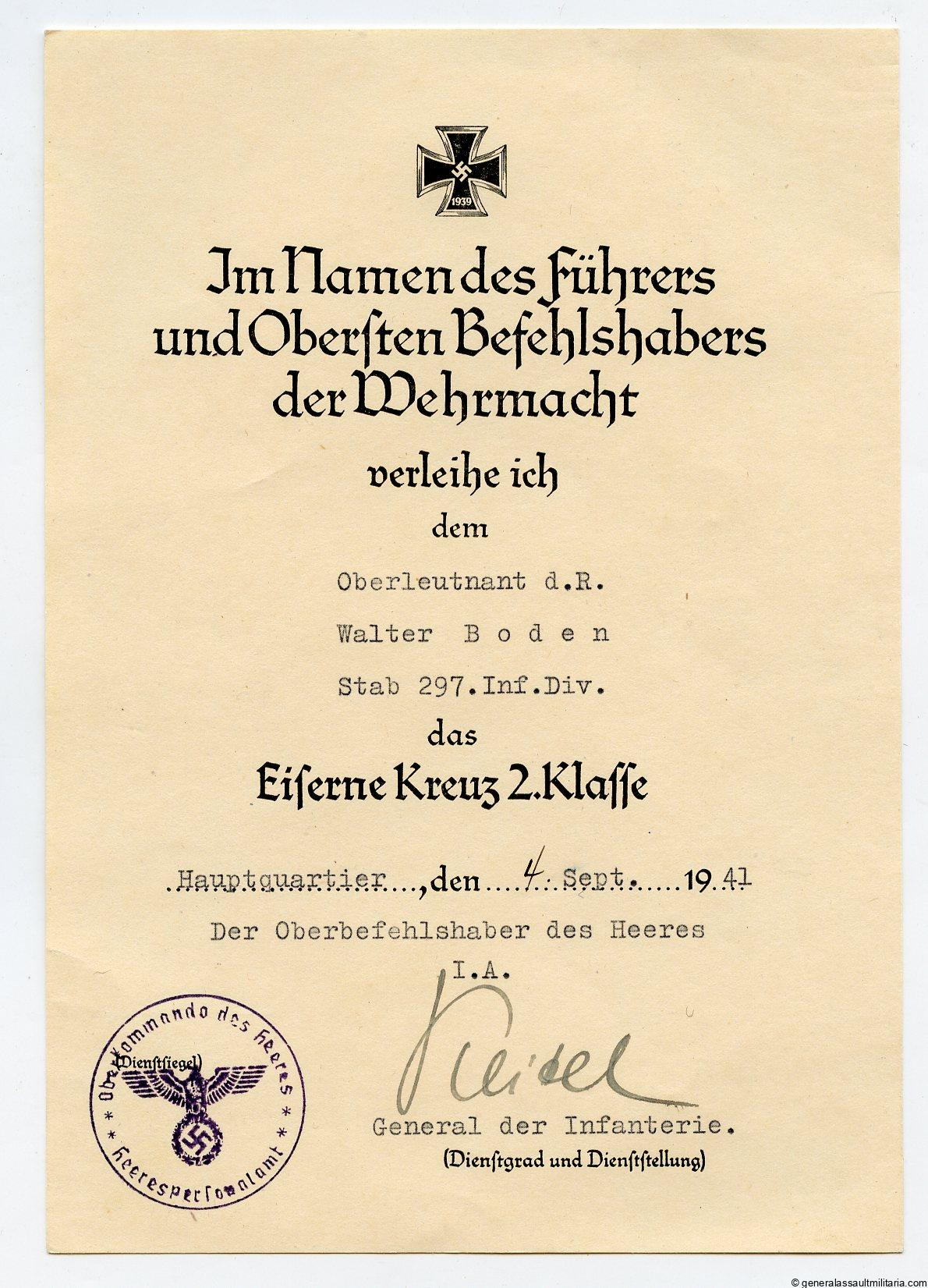 Award certificate Ek2 Oberstleutnant Boden 297.Inf. Div. Mint document for the iron cross 2nd class with Keitel signature, for an Oberleutnant d.R. Walter Boden Stab 297 Infanterie Division. The unit was deployed with Army group South and was later present near Stalingrad. Excellent example!
