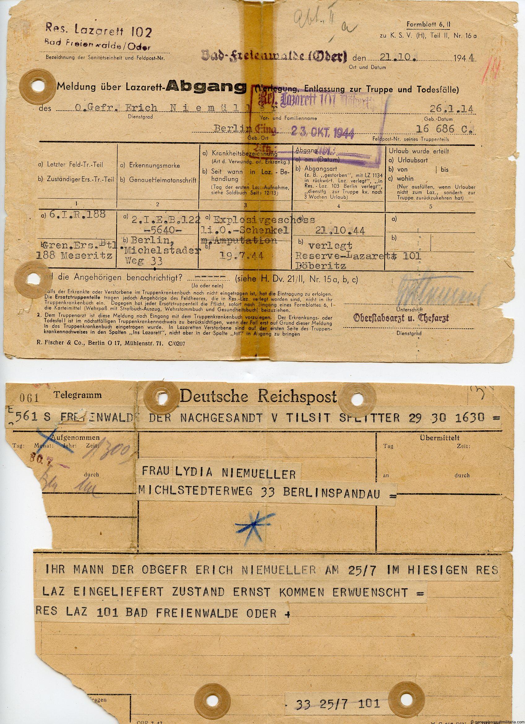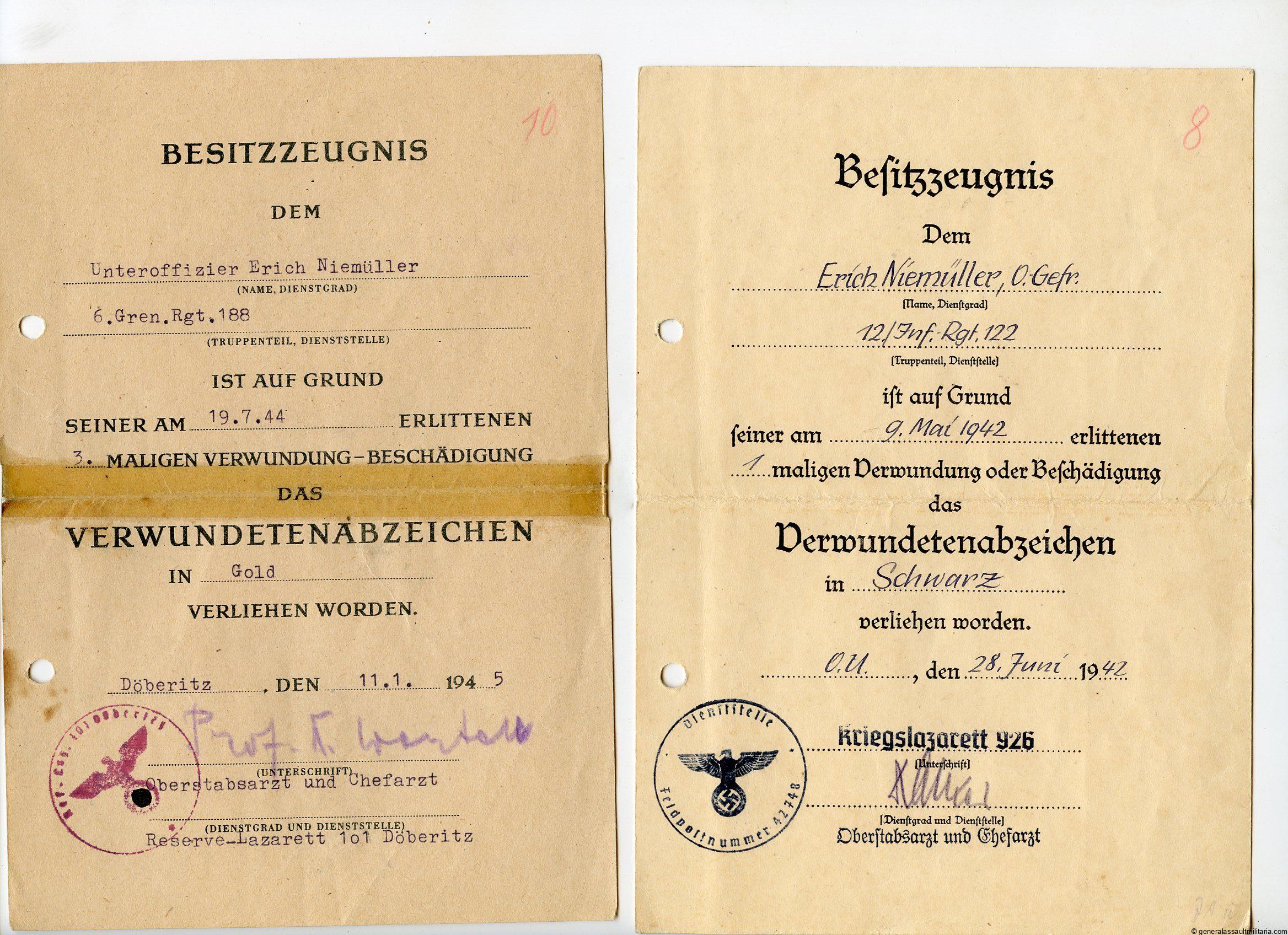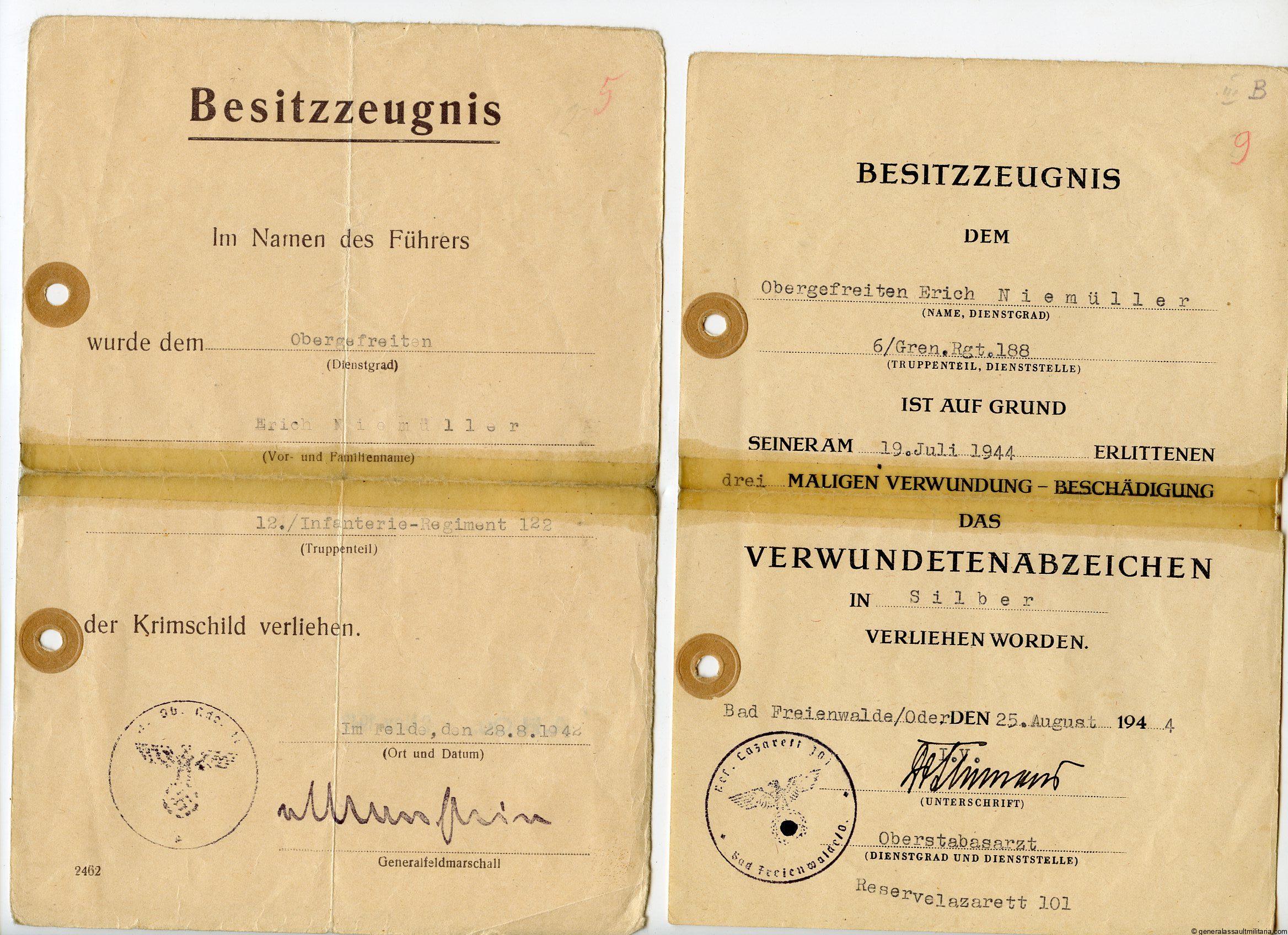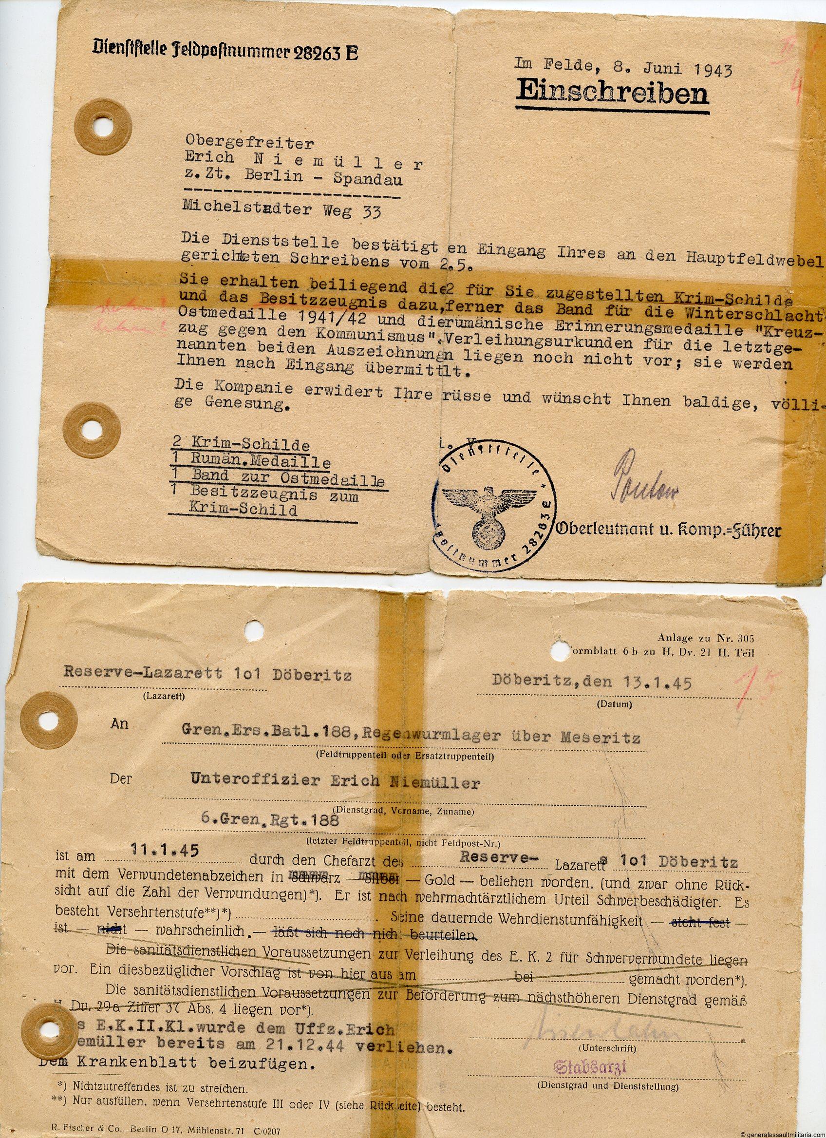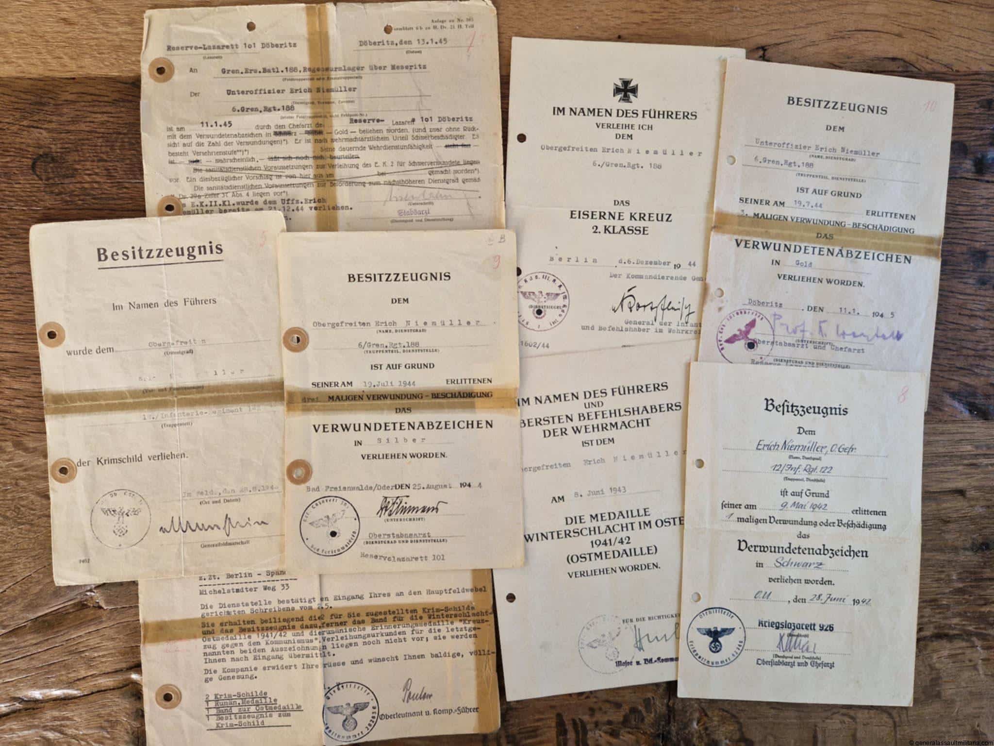 Award document grouping Erich Niemüller Grenadier Regiment 188. Interesint grouping consisting out of 6 of the 7 award documents too Niemüller, who was awarded the Krim shield, Ek2, Ost medal and all three wound badges. The silver and gold wound badges were awarded for his 3 wound that was caused by an explosion for which his leg was amputated. Also present are a latter about him receiving a few awards and documents as well as the document about his stay in the hospital. Interesting set with documents in used condition.