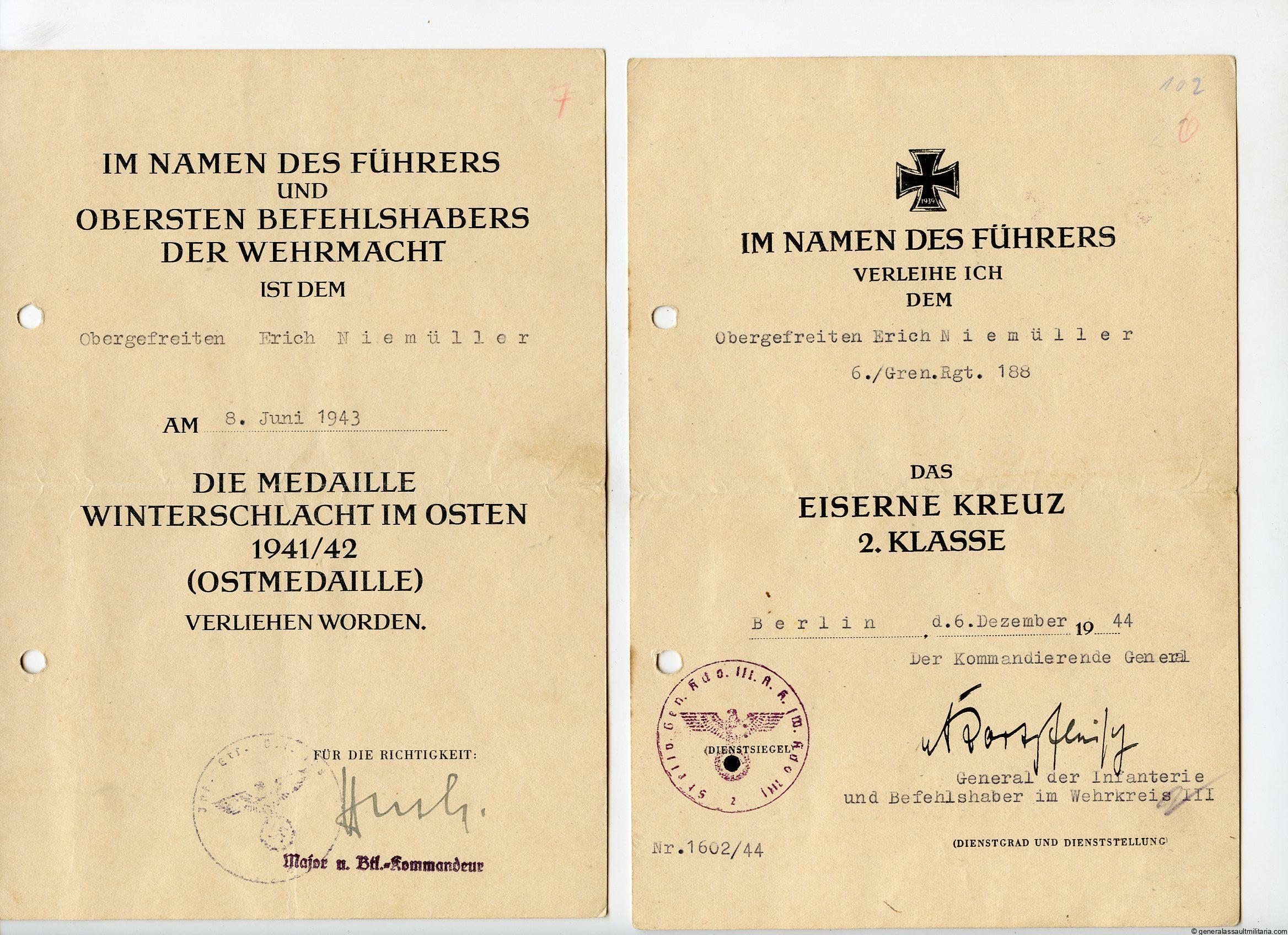 Award document grouping Erich Niemüller Grenadier Regiment 188