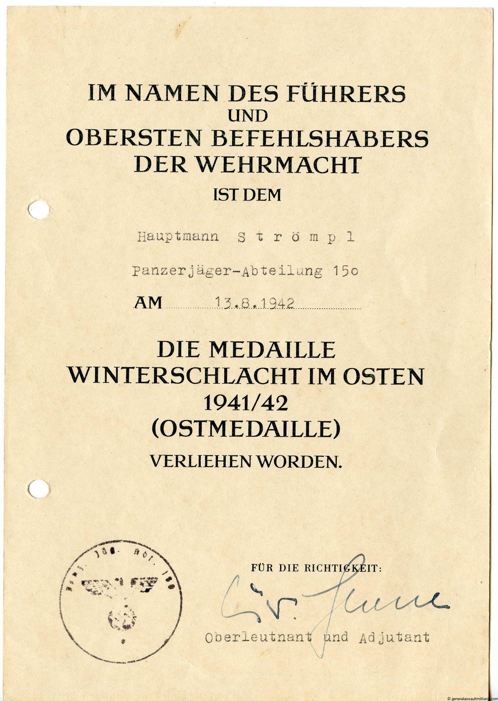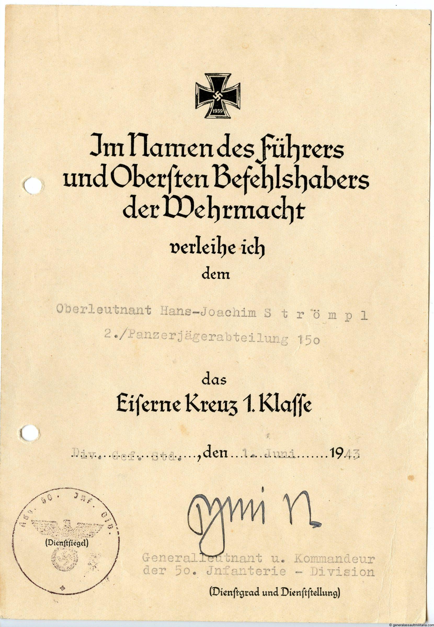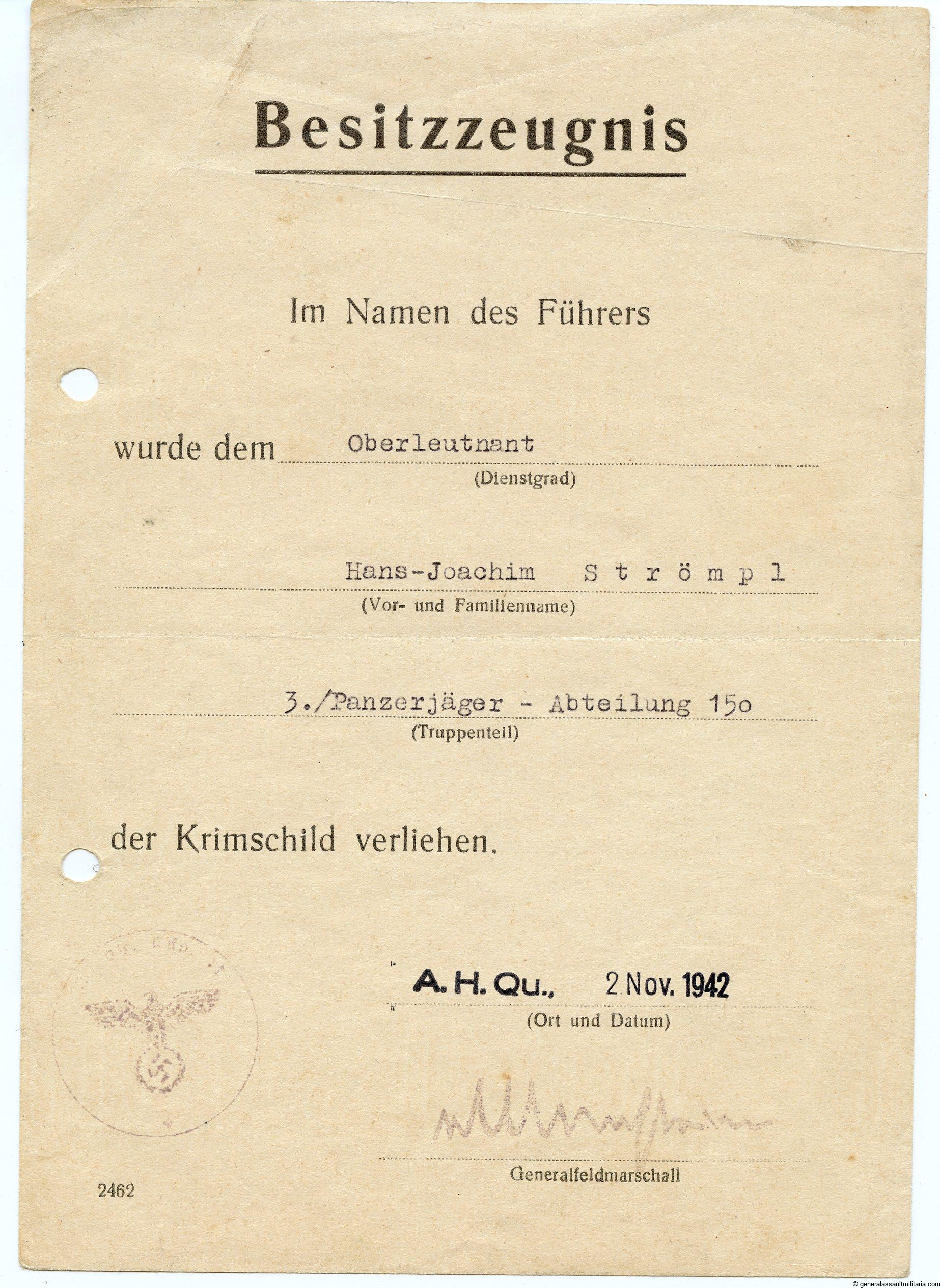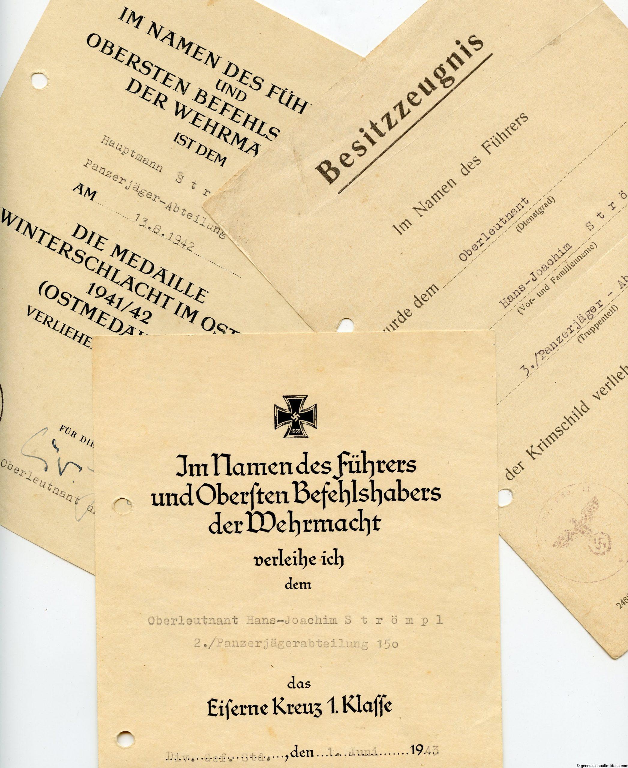 award grouping to Hauptmann Strömpel, chef 3./Pzj. Abt. 150