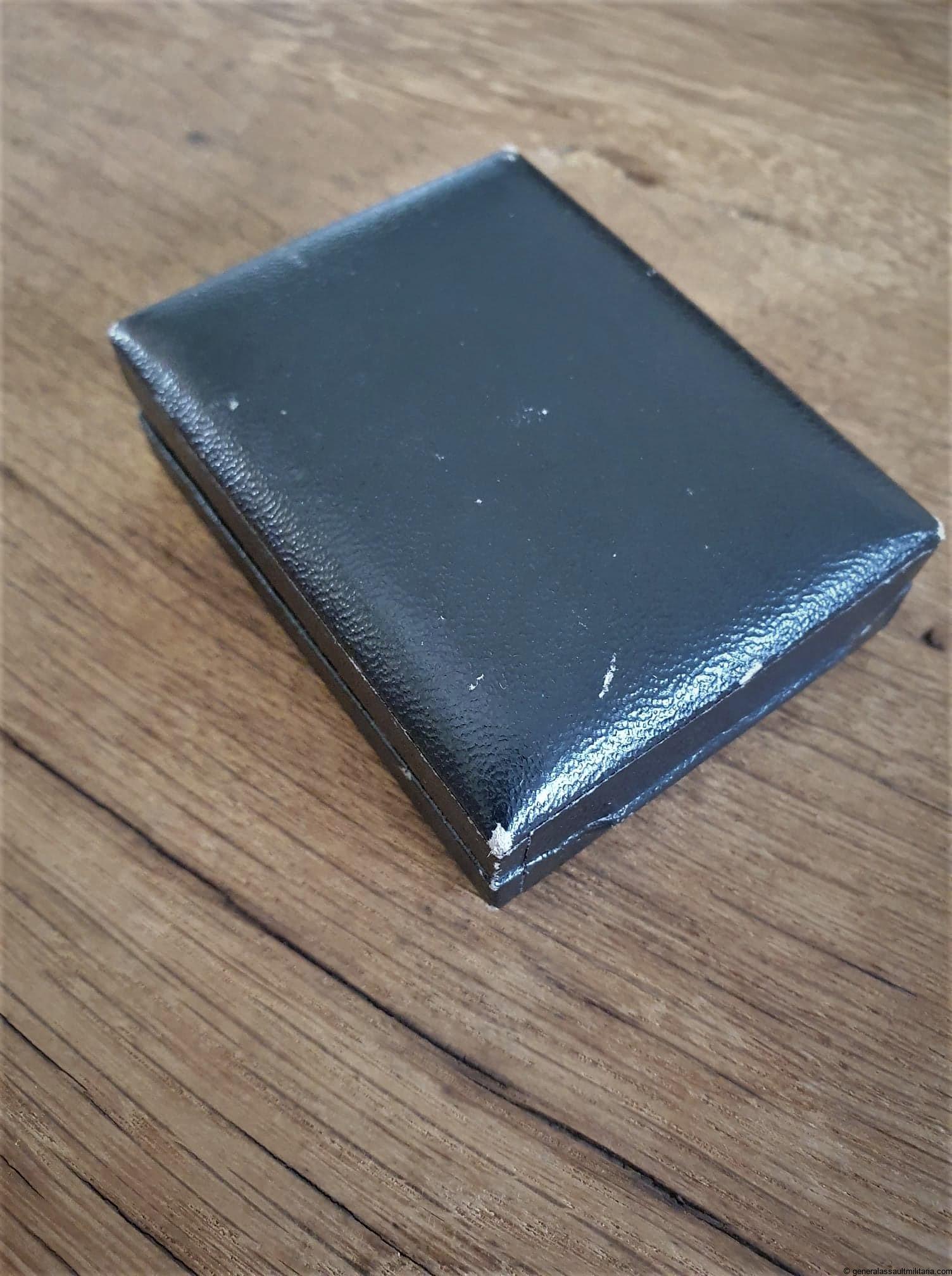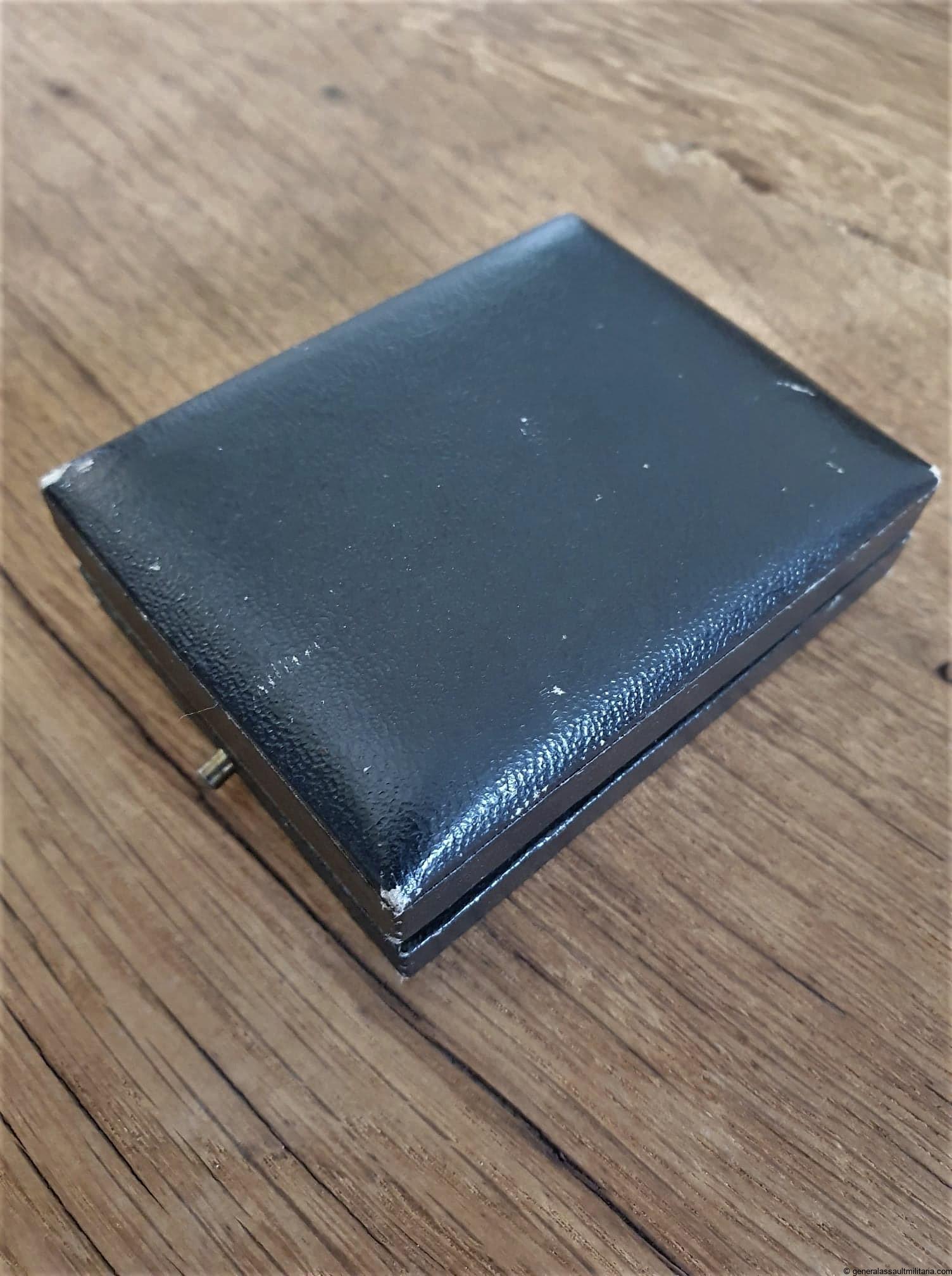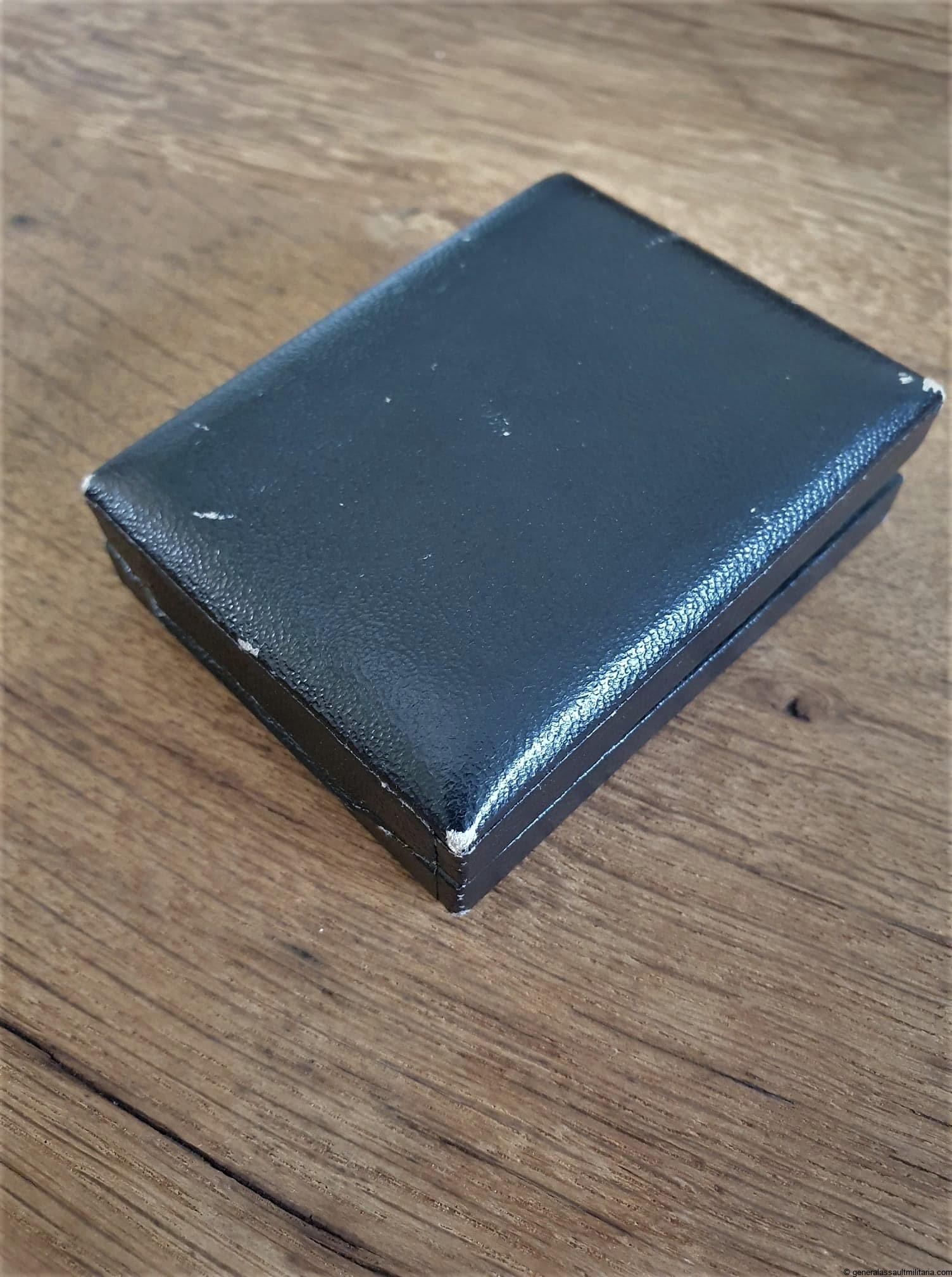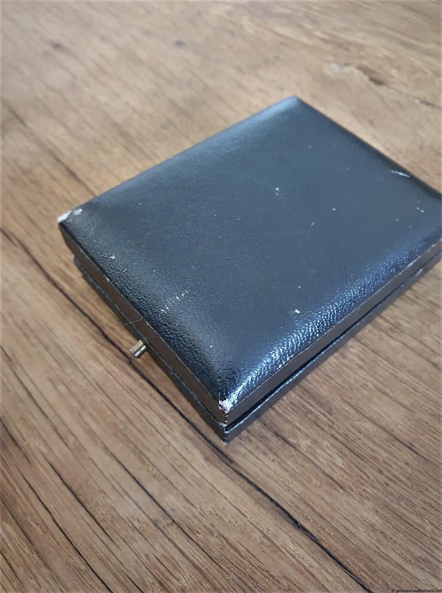 Black case for a TeNo(Tehnische Nothilfe) badge. Remains in used condition with some wear to the edges but overall good condition. The inside is still bright and there was a wound badge stored in this case for many years. Still has the stamp on the bottom which more often seen on this type of case. Rare case that is difficult to find if you are looking for it.