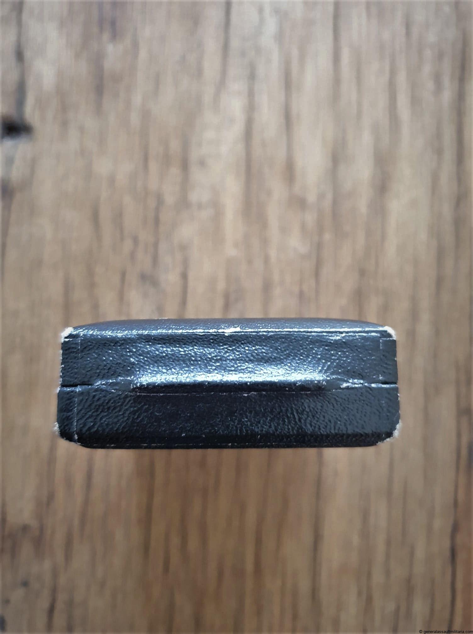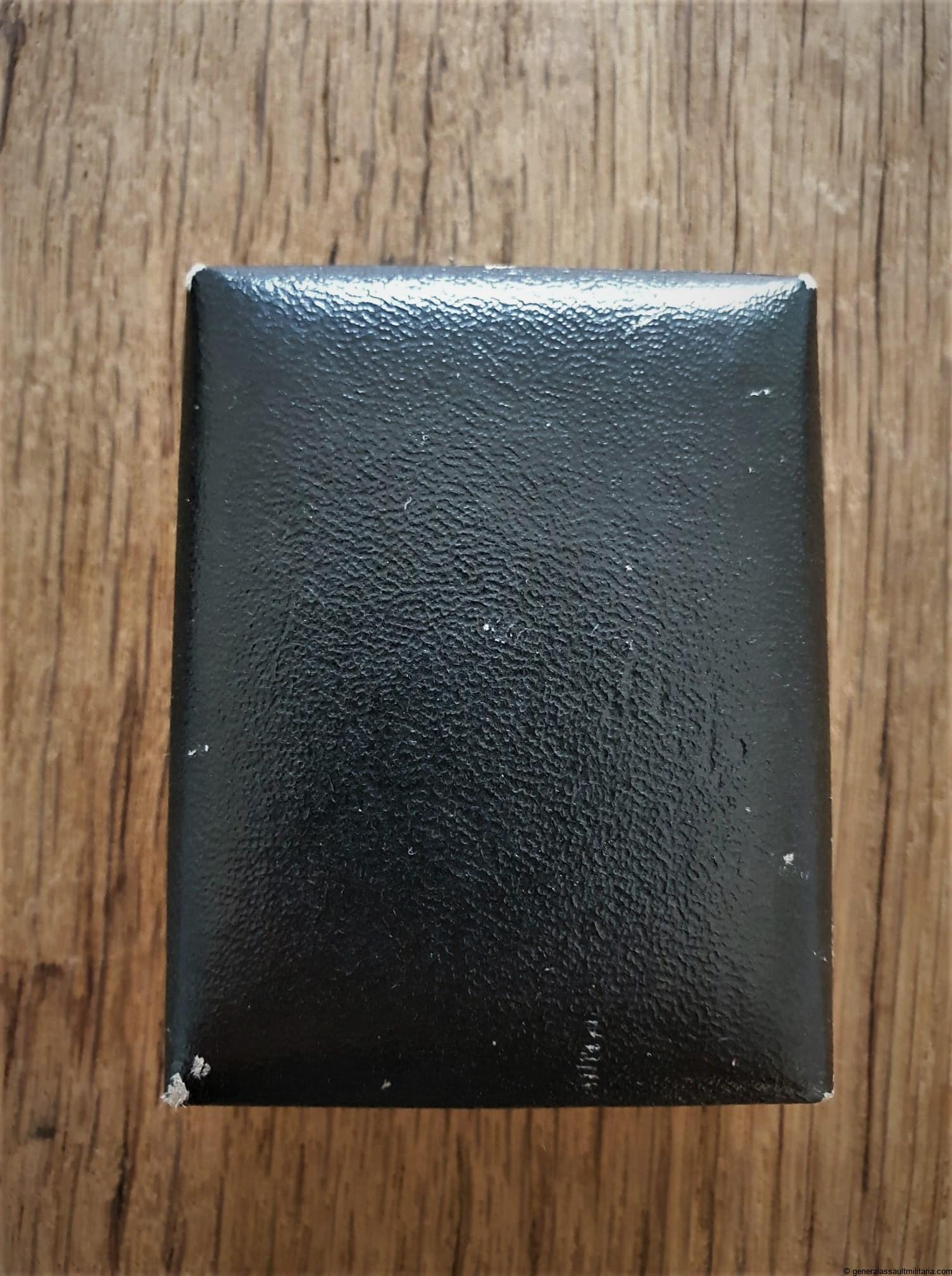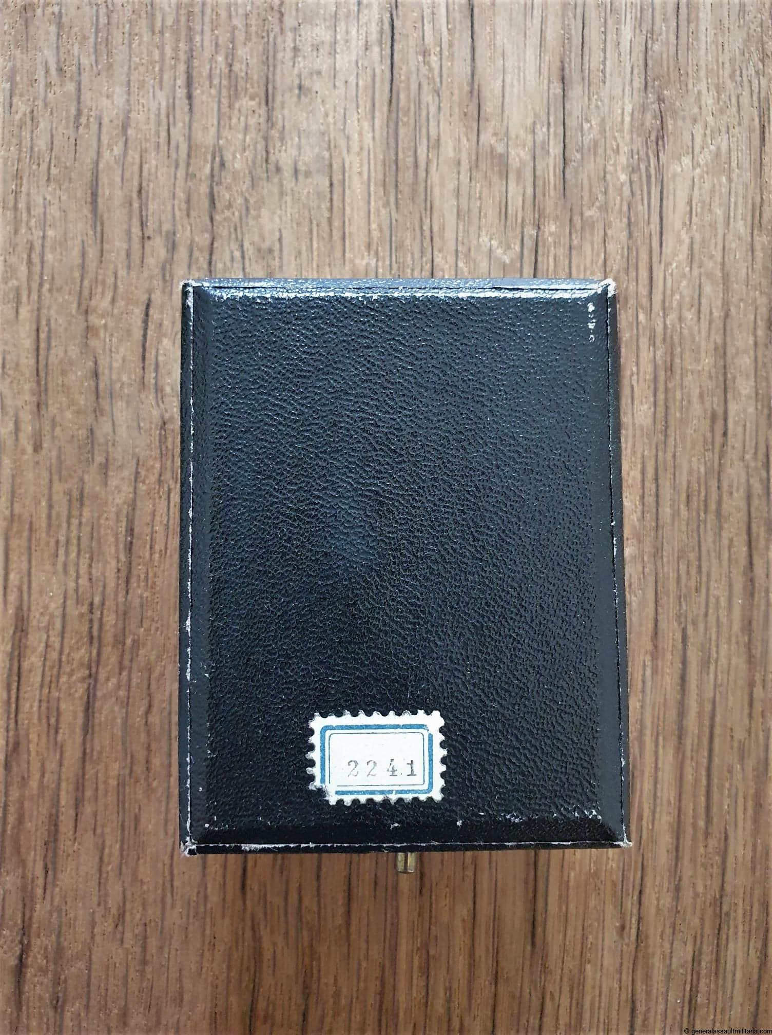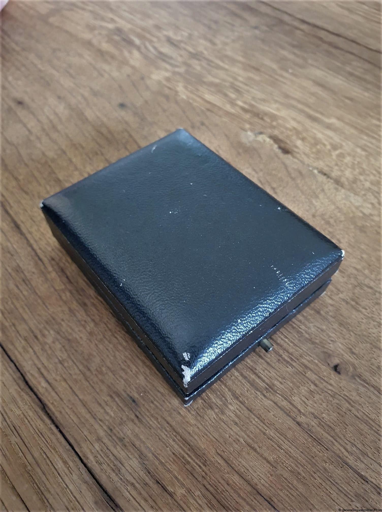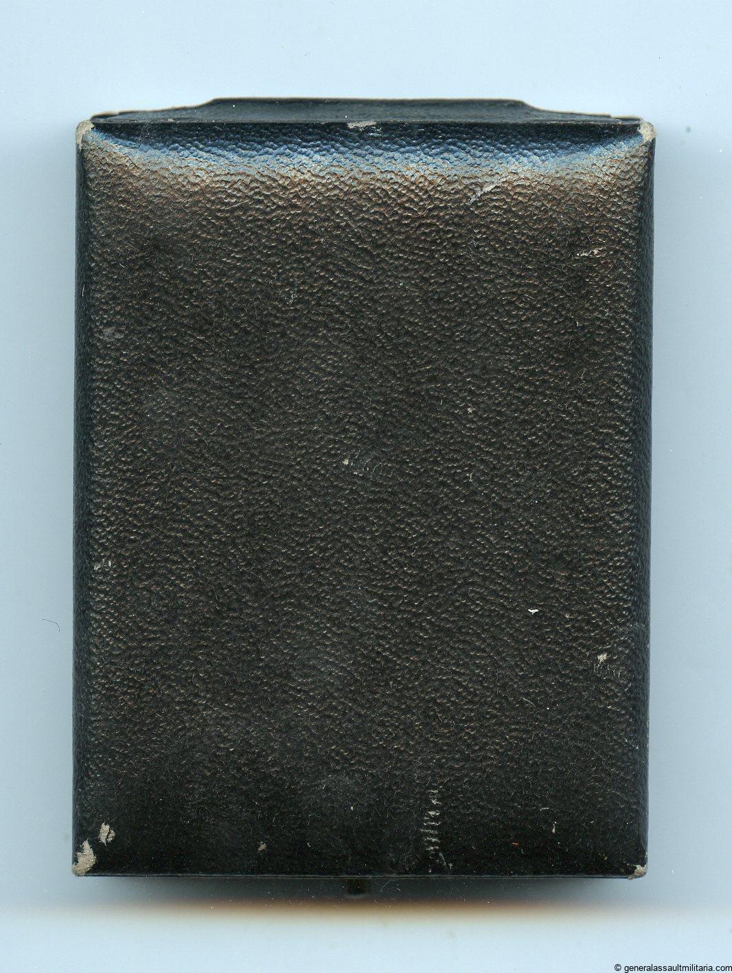 Black case for a TeNo(Tehnische Nothilfe) badge. Remains in used condition with some wear to the edges but overall good condition. The inside is still bright and there was a wound badge stored in this case for many years. Still has the stamp on the bottom which more often seen on this type of case. Rare case that is difficult to find if you are looking for it.