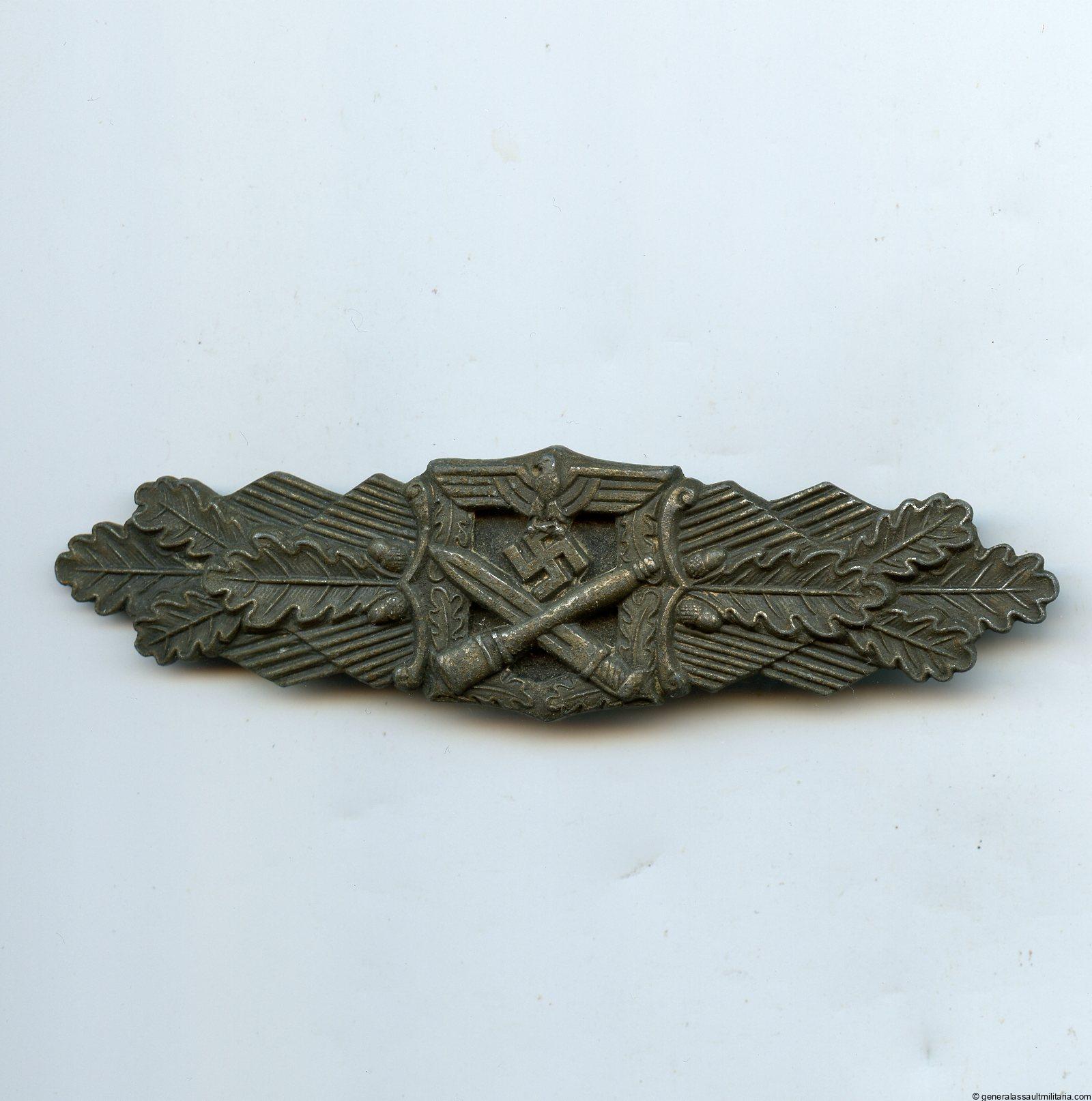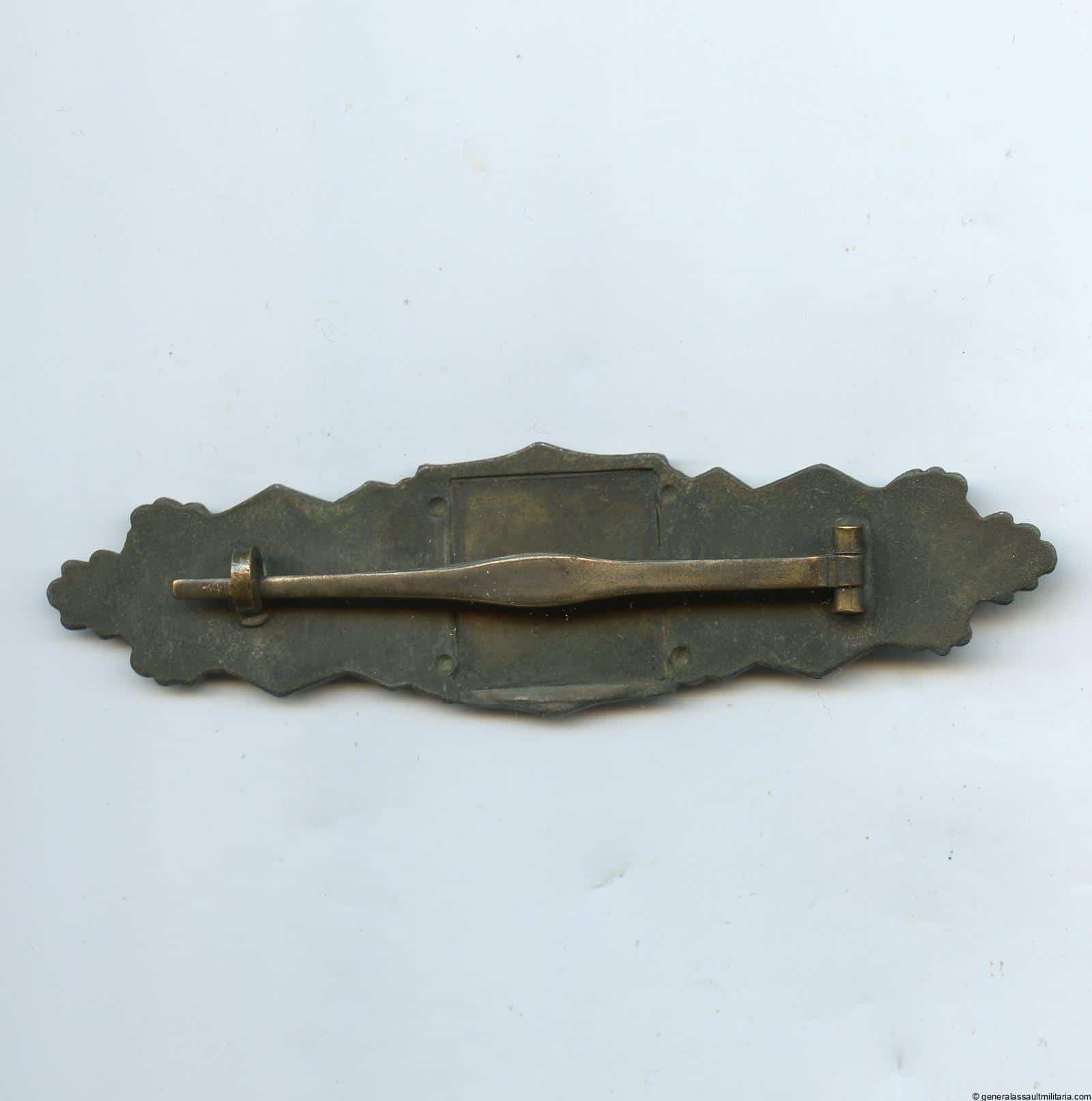 Close combat clasp in bronze – 6-dot. Mid to late war zinc ‘Nahkampfspange in Bronze’ with 6 dot crimp. Remains in worn condition and has most of the bronze finish faded. Good quality CCC with a back plate that nearly always remains present and tightly crimped. Good worn example.