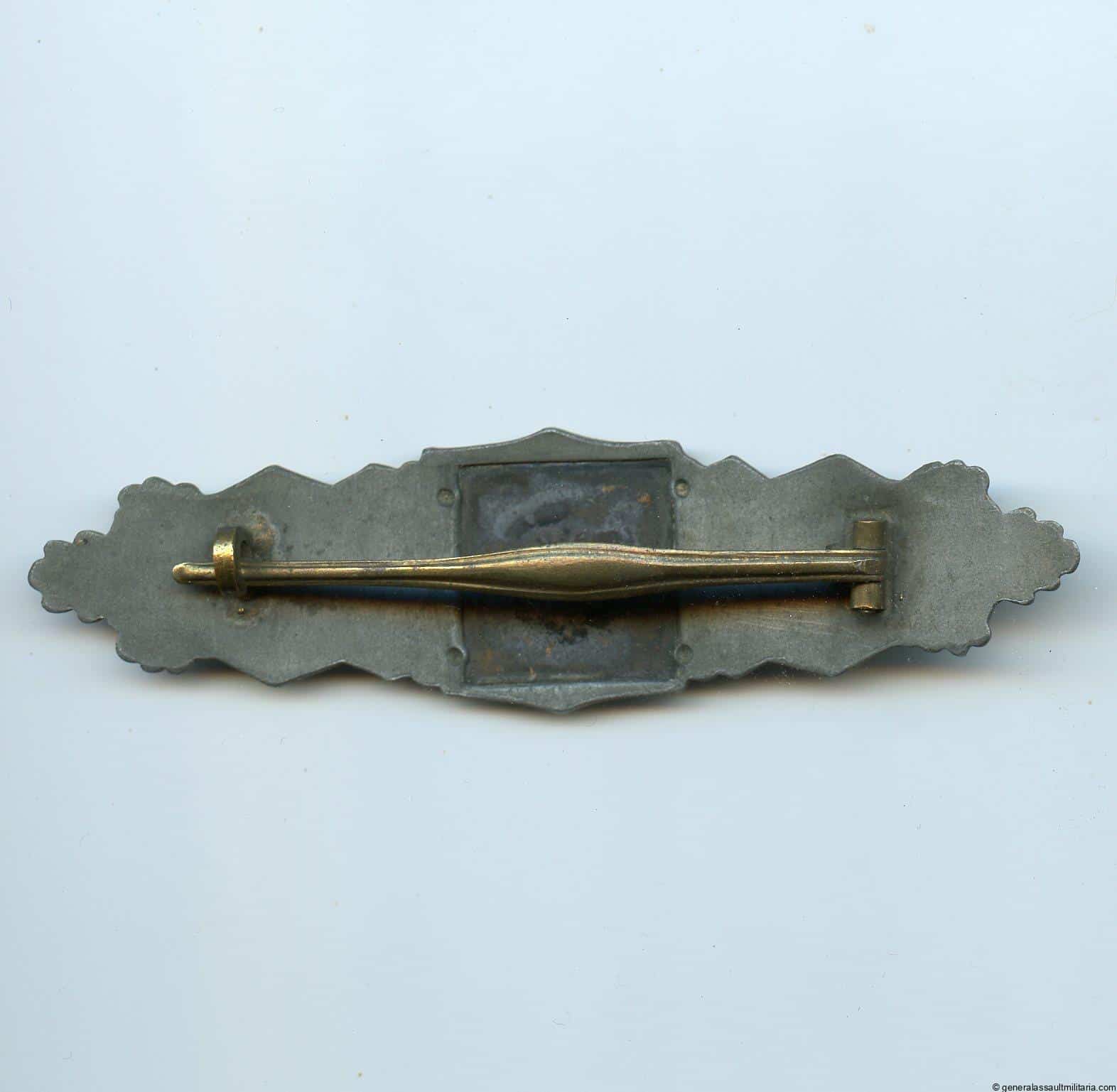 Close combat clasp in bronze – 6-dot. Zinc construction with steel back plate and 6 dot crimp. Remains in very good lightly worn condition with faded finish. Good quality ‘Nahkampfspange’ with a great curved look.