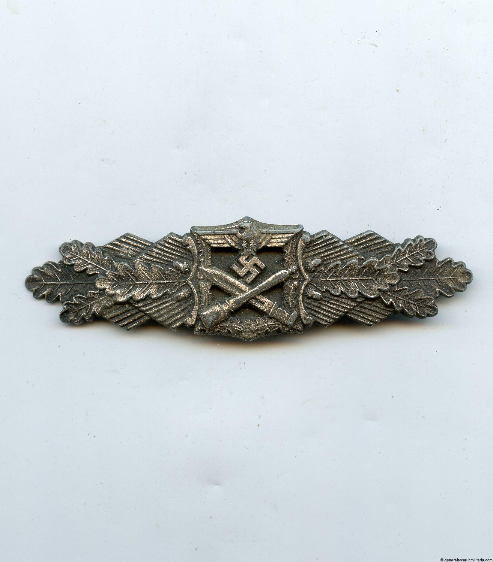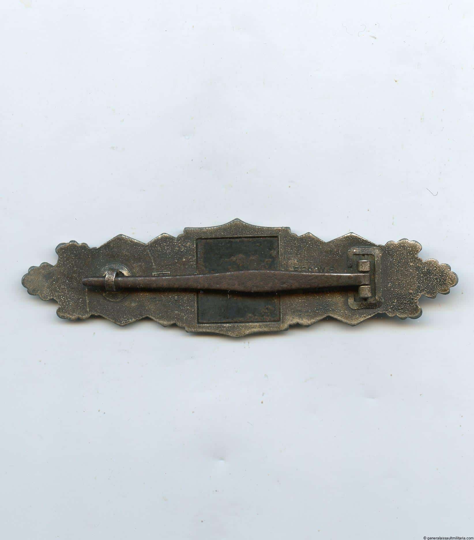 Close combat clasp in silver – Josef Felix & Söhne, Gablonz. Zinc 1st pattern JFS ‘Nahkampfspange’ with crimped in setup. Remains in worn condition with some of the silver finish worn down on the higher parts. The thick silver plated finish is partially patinated with a good dark silver patina. Very good quality JFS CCC with the anodized black plate still in very nice tight crimped condition. Very rare to find a nice worn silver CCC, only so few awarded.