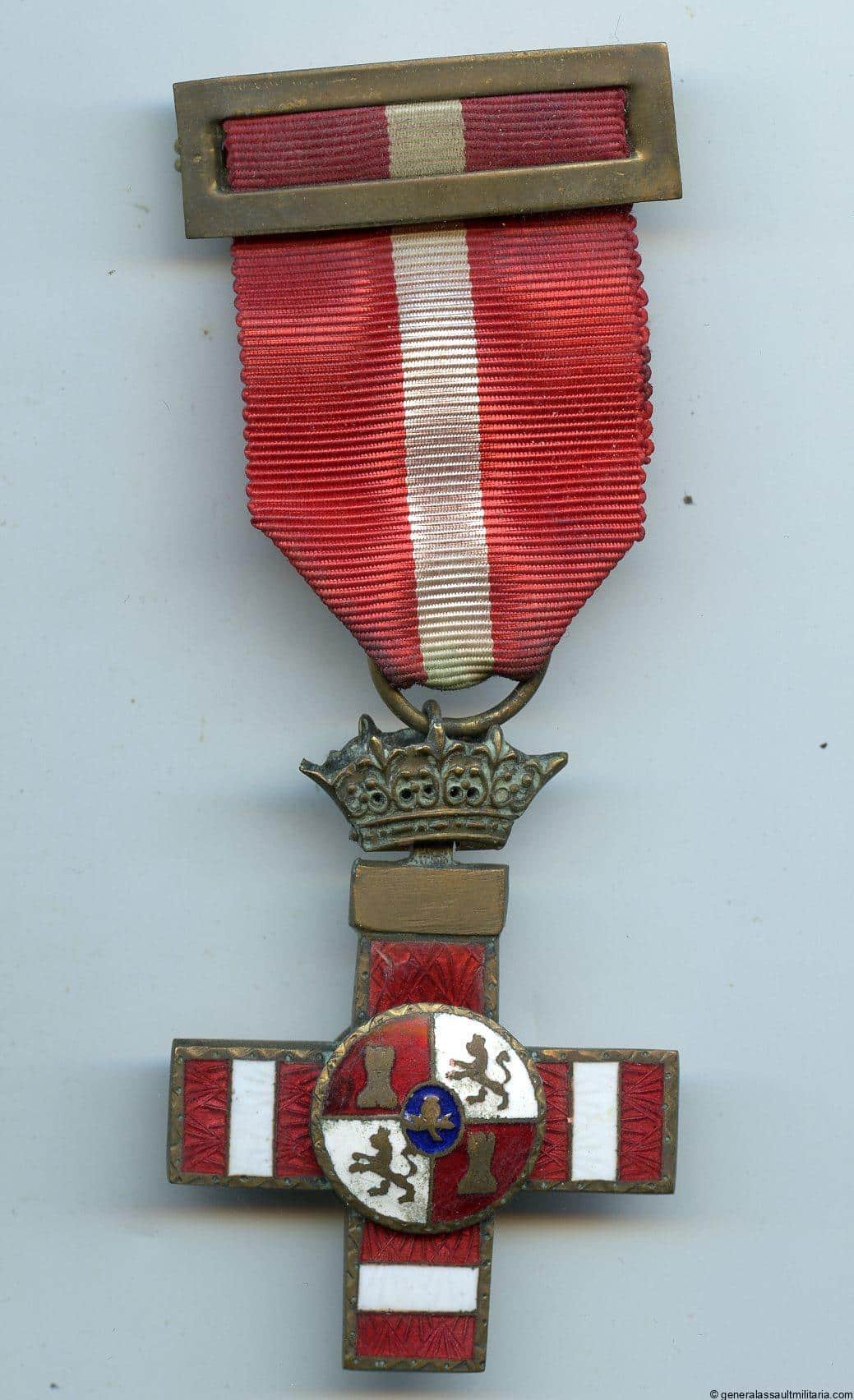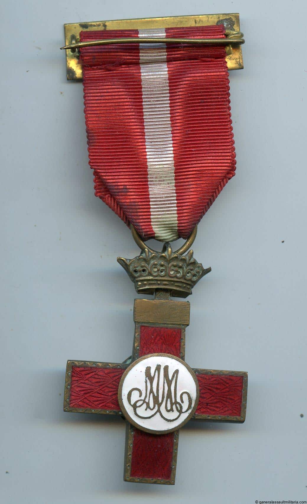 Cross for military merit red ribbon for veterans. Tombac construction with blue and red enamel inlay, decorative pattern on the edges and separate crown. Remains average condition with good enamel but some age from storage. More uncommon type.