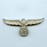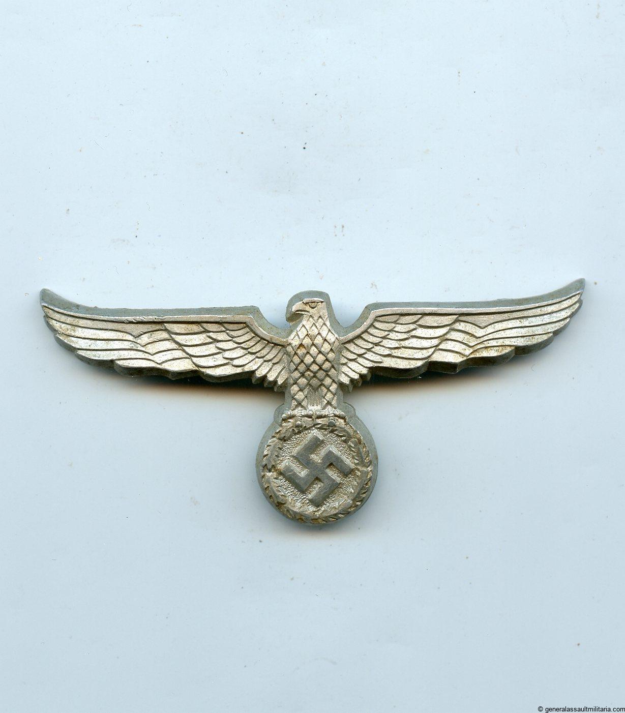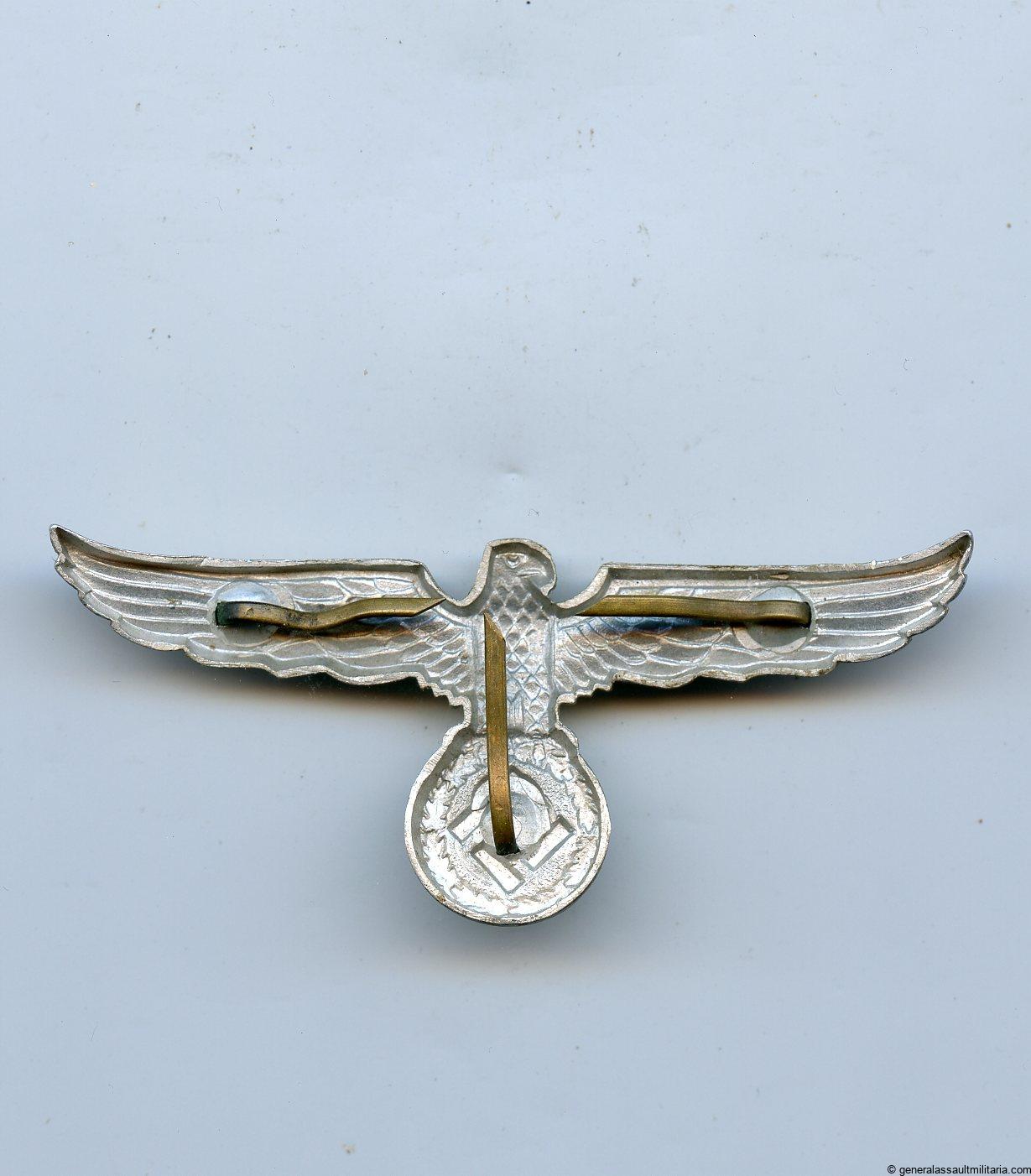 Customs official visor cap eagle. Early aluminum version without RZM makers mark. Remains in good condition with some light patina on the front and all three crimped prongs still intact.