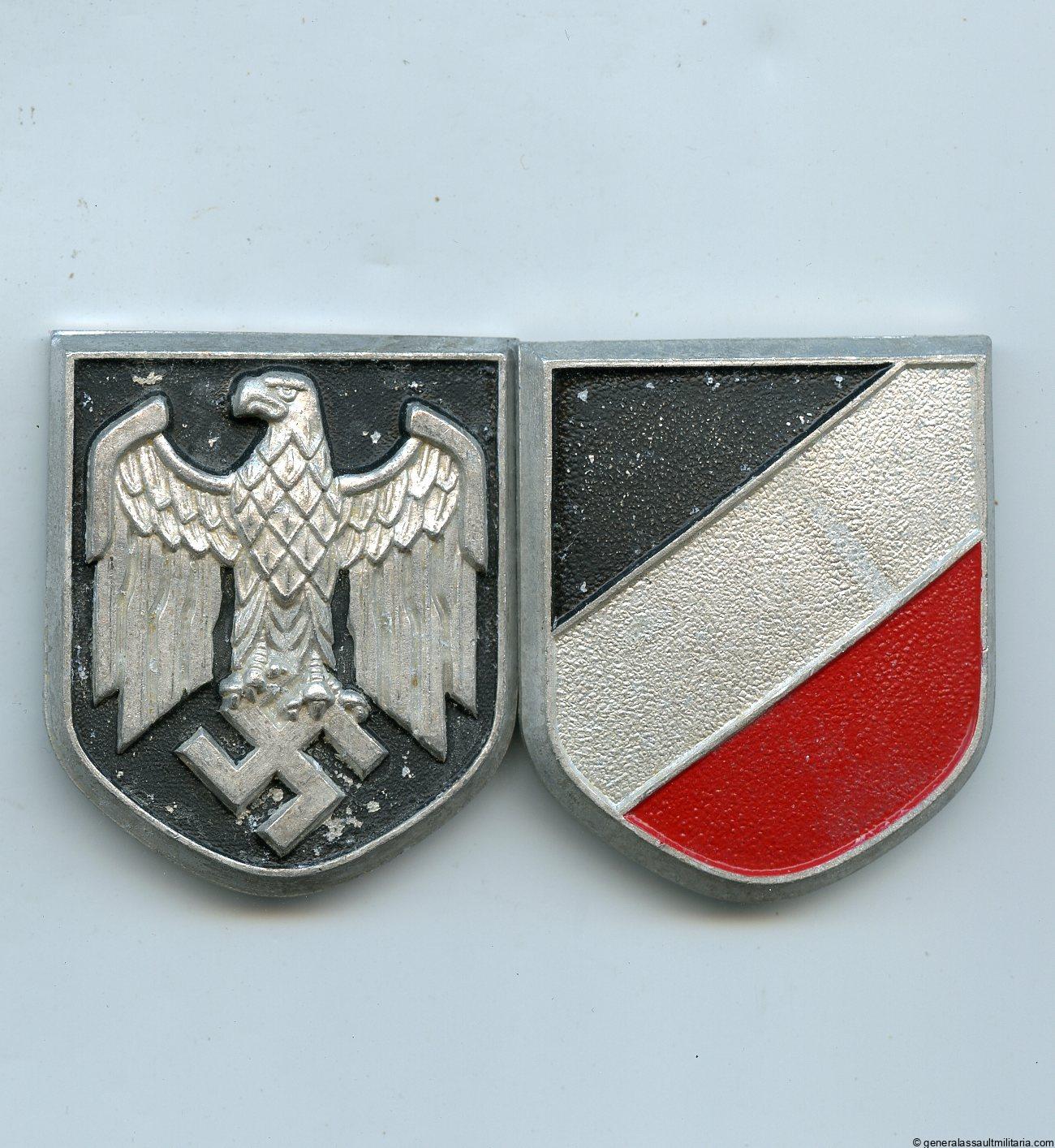 DAK Pith helmet insignia shield set – Paulmann & Crone, Lüdenscheid. Early aluminum construction with 3 prong crimped setup and PC makers mark. Remain in good condition with some wear from storage but remain unworn/issued.