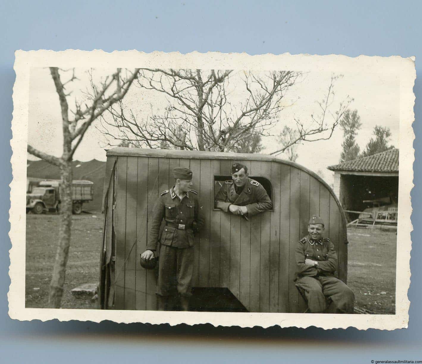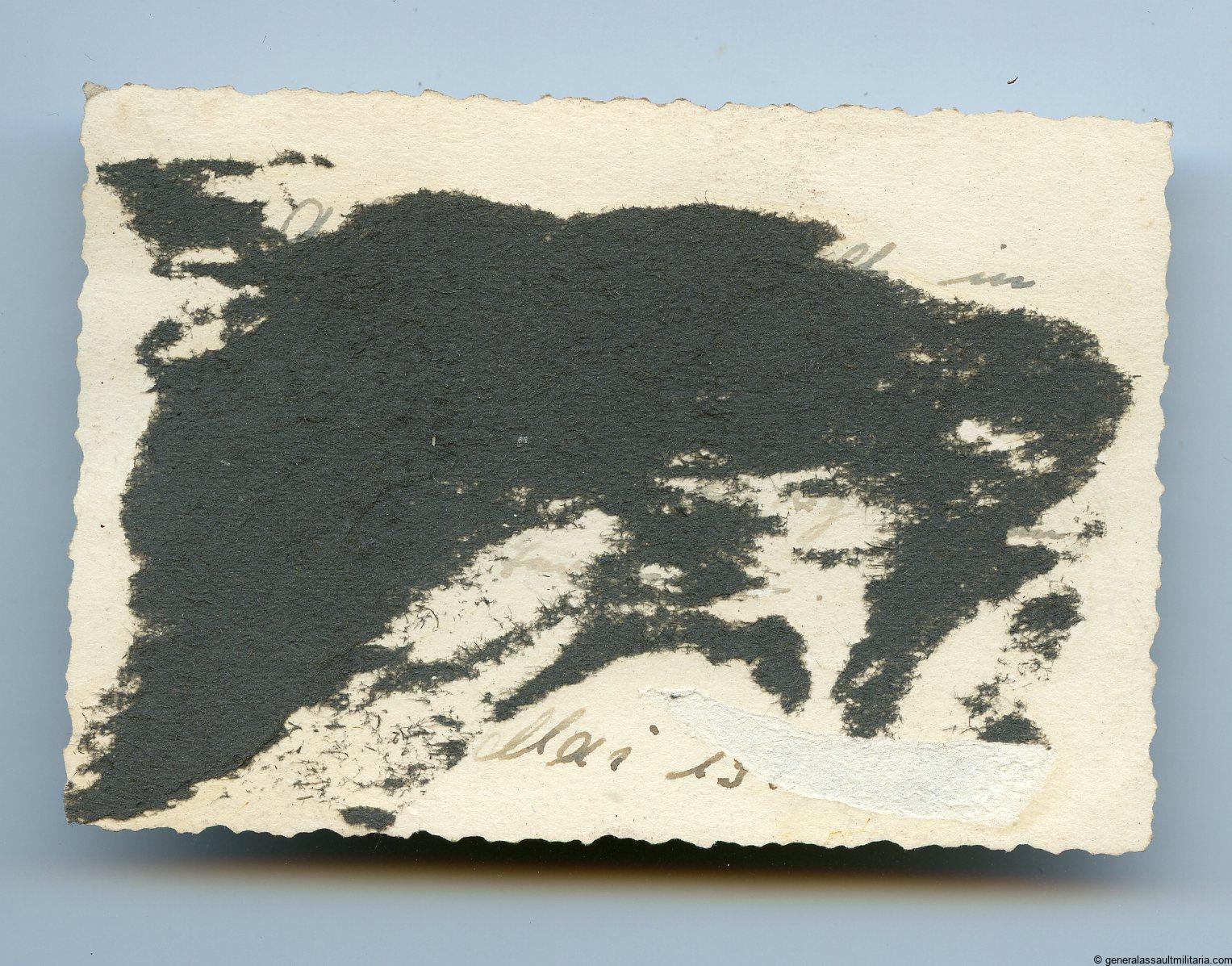6×9 Private made SS photo with Das Reich cufftitle and Assault wrap in wear. Also shows a wooden panther in the shed in the right corner. Interesting shot with a lot going on. Has writing at the back but was album removed at some point in time and impossible to read.