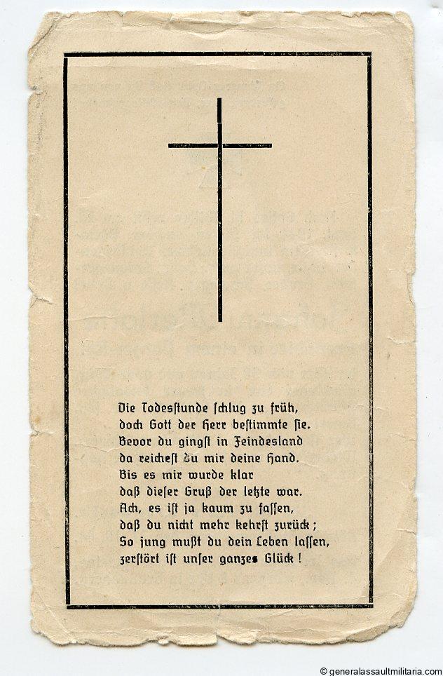 Death card Johann Merlotte – KIA Italy. Grenadier Panzer-Rgt KIA on 28.09.1944 Adria-Küste. Some wear, rarer late war Sterbebild.
