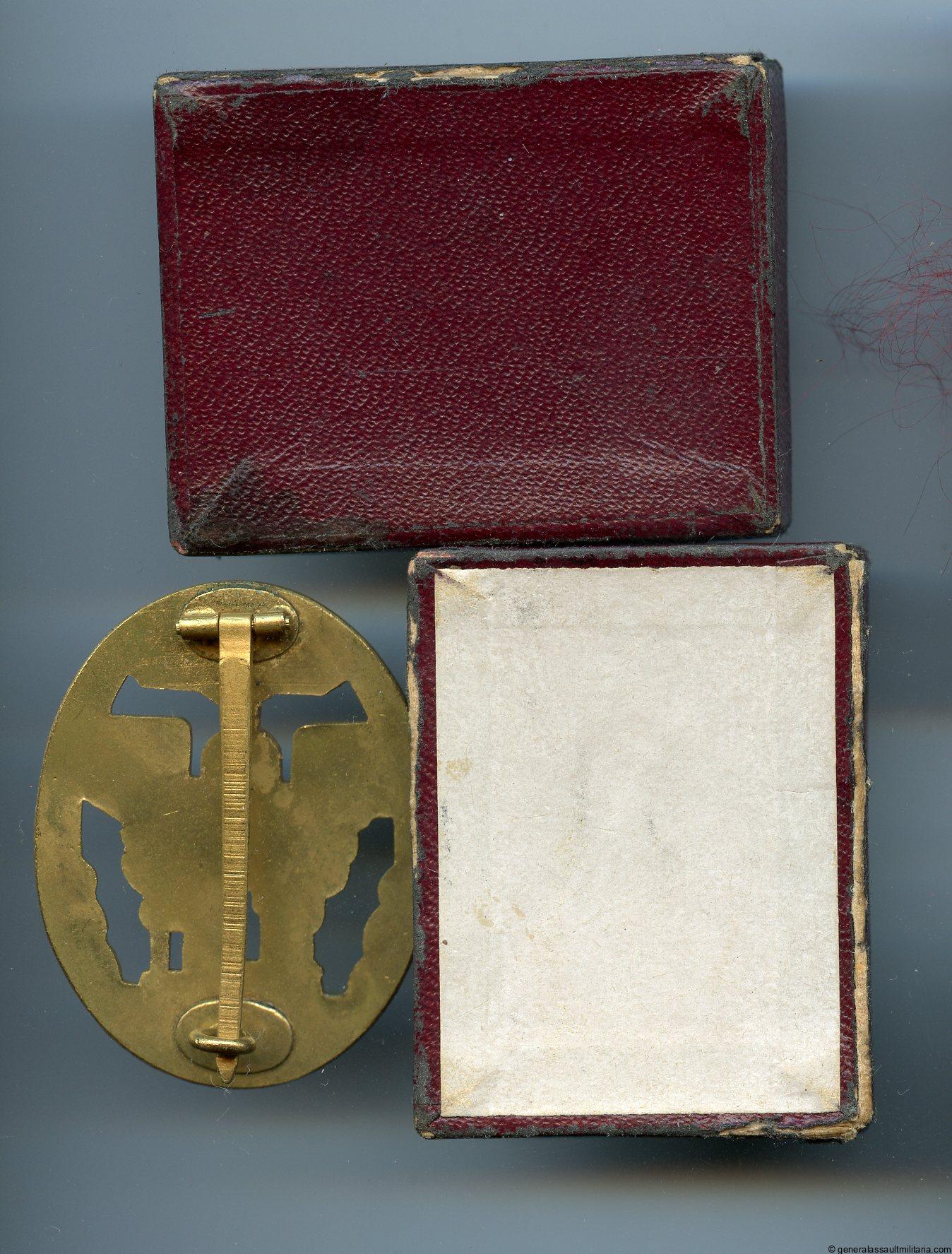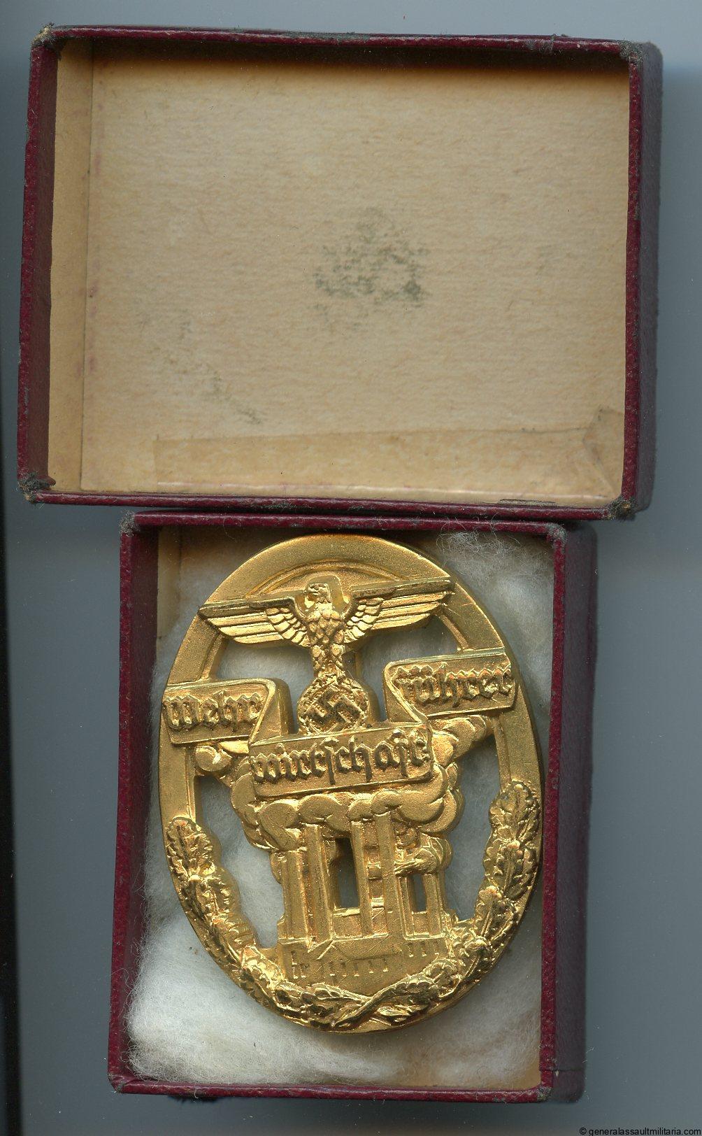 Defence Economy leaders badge – Unknown maker. Solid cupal construction ‘Wehr-Wirtschafts-führer Abzeichen’ with wide pin set and gilded finish. Remains in perfect mint and unworn condition. A very uncommon NSDAP badge that was awarded to civilians that added the third Reich production for material for the army. This example comes with a period case that has some tape on the inside to keep the corners together. This is the original box for this award, it came together and the past owner insured me was acquired like this from the vets family. Top unupgradable and very uncommon badge.