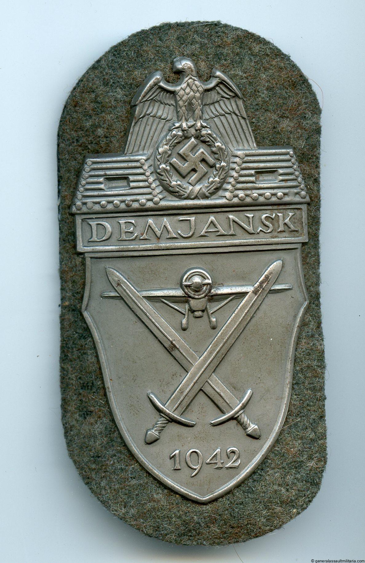 Demjansk shield Heer – unknown maker. Steel construction Demjansk shield with silver finish, 4 small prongs, back plate and backing paper. Remains in near mint unworn condition with full finish, backing paper with the typical unused holes for this variant. Top and textbook Demjansk that is very difficult to find nowadays.