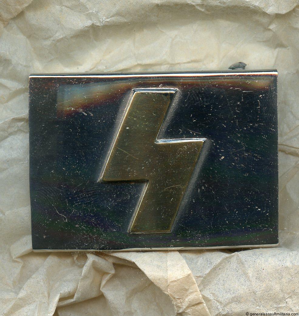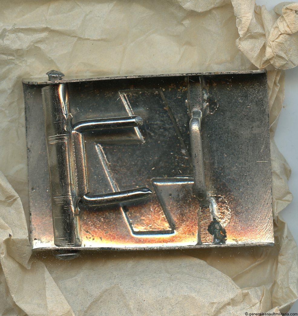 Deutsche Jungvolk buckle – unmarked. Small tombac buckle with ‘Sig rune’ on the front and nickel plating around it. Remains in perfect mint condition and came from a hoard find, still has the original wrapping paper present. Stone mint example with a mirror like surface.