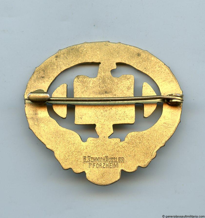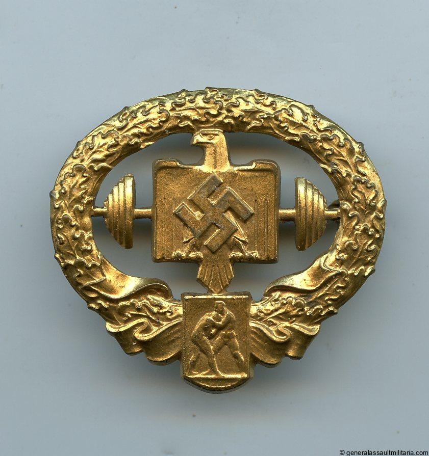 Deutsches Schwersportathleten-Sportabzeichen in gold – E. Schmidthäussler, Pforzheim. Very rare gold grade of the Heavy lifting sports badge, maker marked with the ESP mark on the reverse. Remain in excellent lightly worn condition with nearly all the gilding preserved. Comes with a award document booklet that was never used and remains completely empty. Very rare badge and only the first time we had this gold grade on offer.