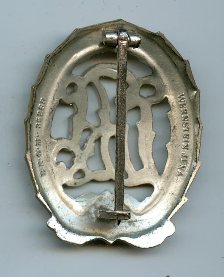 DRL sports badge for war wounded – Wernstein, Jena. Tombac construction DRL sports badge with silver plated finish and gilded wreath. Remains in excellent condition with all the silver plating and gilding still present, minimal wear and patina tot he front. Awarded to wounded soldiers for achievements in sports. ‘Reichssportabzeichen für Kriegsversehrten’