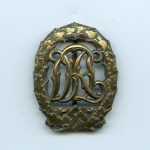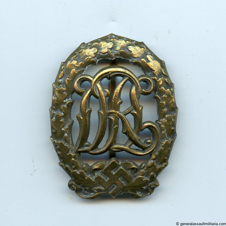 DRL sports badge in bronze – Hermann Wernstein, Jena. Tombac badge with Hermann Werstein variant setup and makers mark. The badge is in worn condition and retained its bronze look nicely.