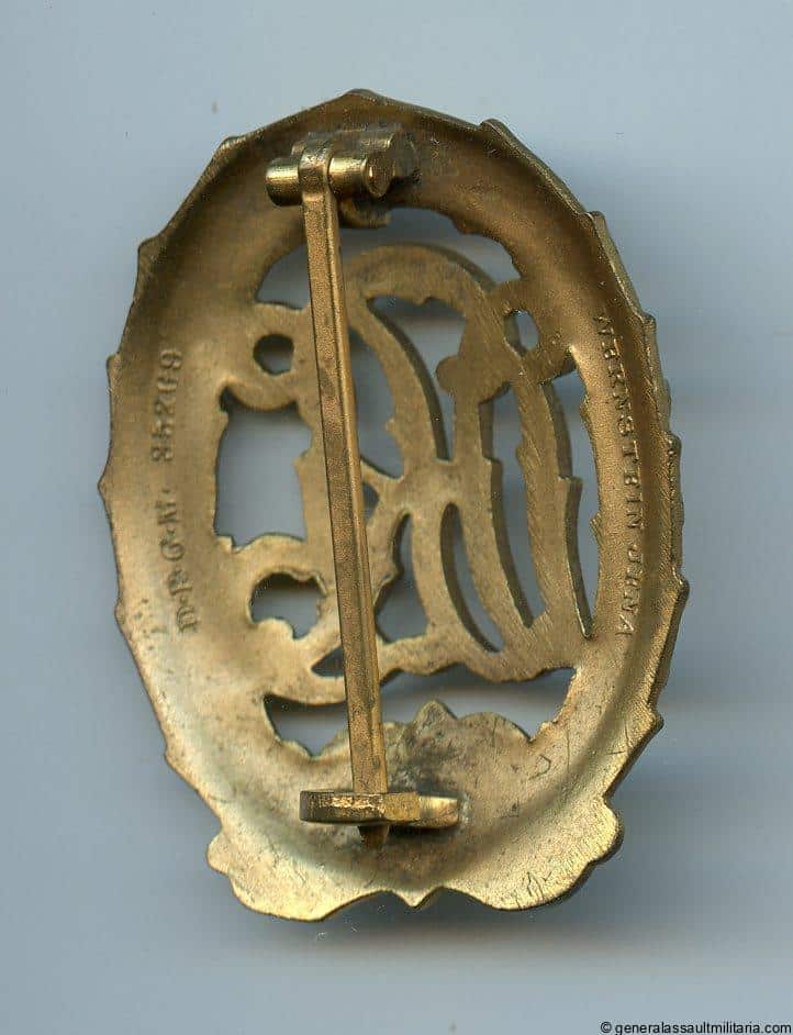 DRL sports badge in gold – Hermann Wernstein, Jena. Early tombac DRL sports badge with the different and thicker gold finish without polished swastika and highlights. Remains in excellent nearly perfect condition and does not show any signs of real wear. Very appealing and not so common gold sports badge.