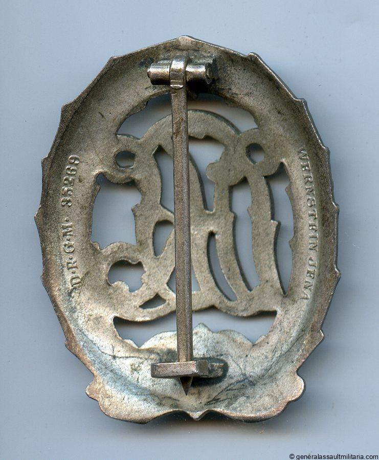 DRL sports badge in silver – Hermann Wernstein, Jena. Pre war tombac sports badge with silver plated finish. Remains in excellent, lightly worn condition with slight patina.