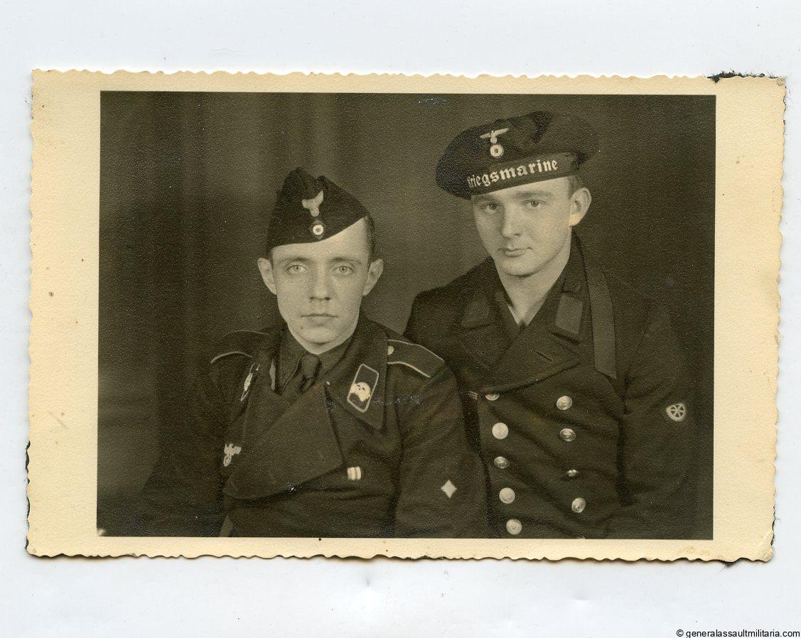 Interesting duo portrait with Kriegsmarine and panzer soldier. Has the 1st pattern SS Danzig SS skull in wear on the tabs. Excellent album removed condition, postcard size.