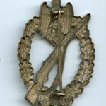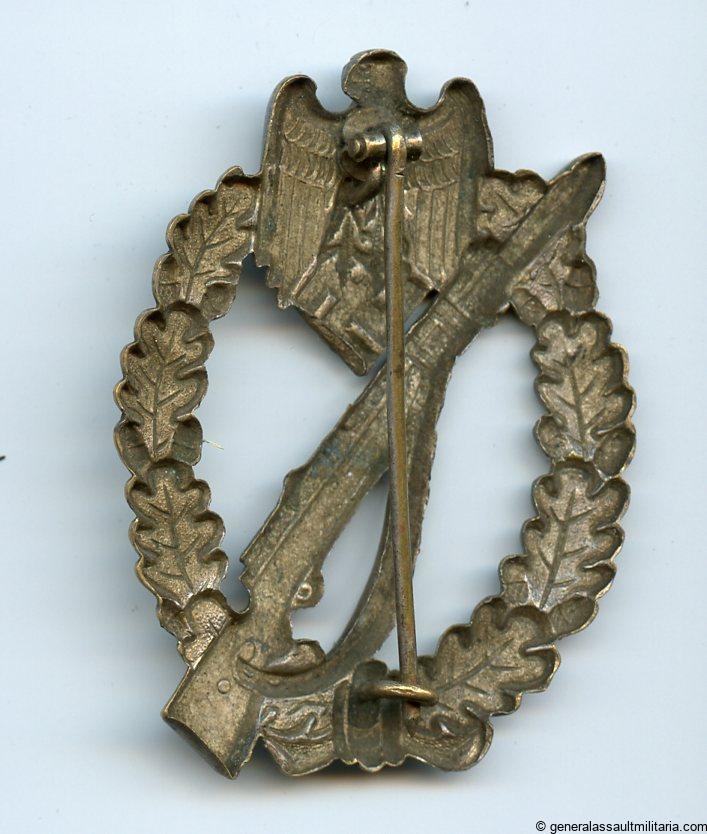 Infantry assault badge in silver – Steinhauer & Lück, Lüdenscheid. Early hollow tombac badge with unique S&L design and directly soldered catch and hinge. The badges remains in well worn condition as is normally the case with the early S&L badges. The silver finish has worn down due to heavy wear giving this badge a great appeal. No real damage or repairs.