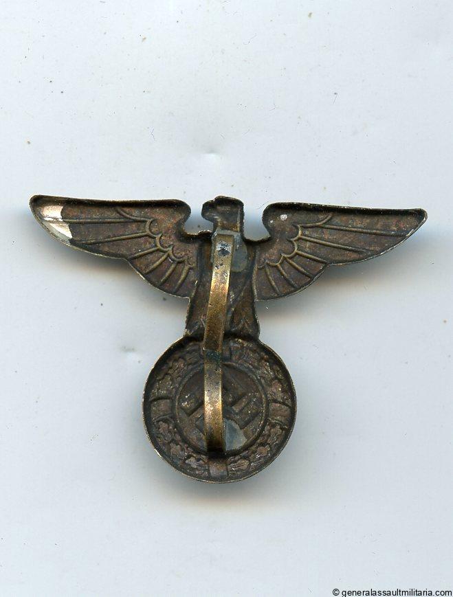 Early political cap eagle. Tombac construction with silver plated finish and black painted swastika. Remains in lightly worn condition with some of the base material exposed and patinated reverse. Both prongs are intact.