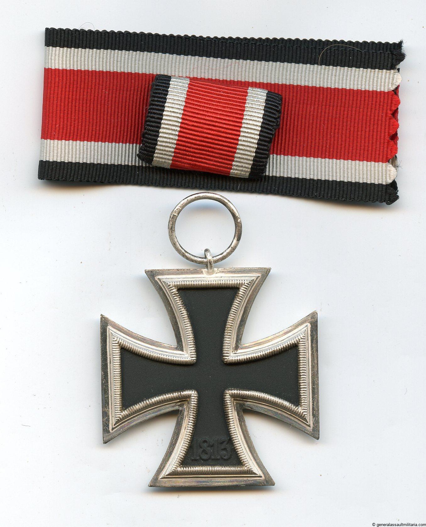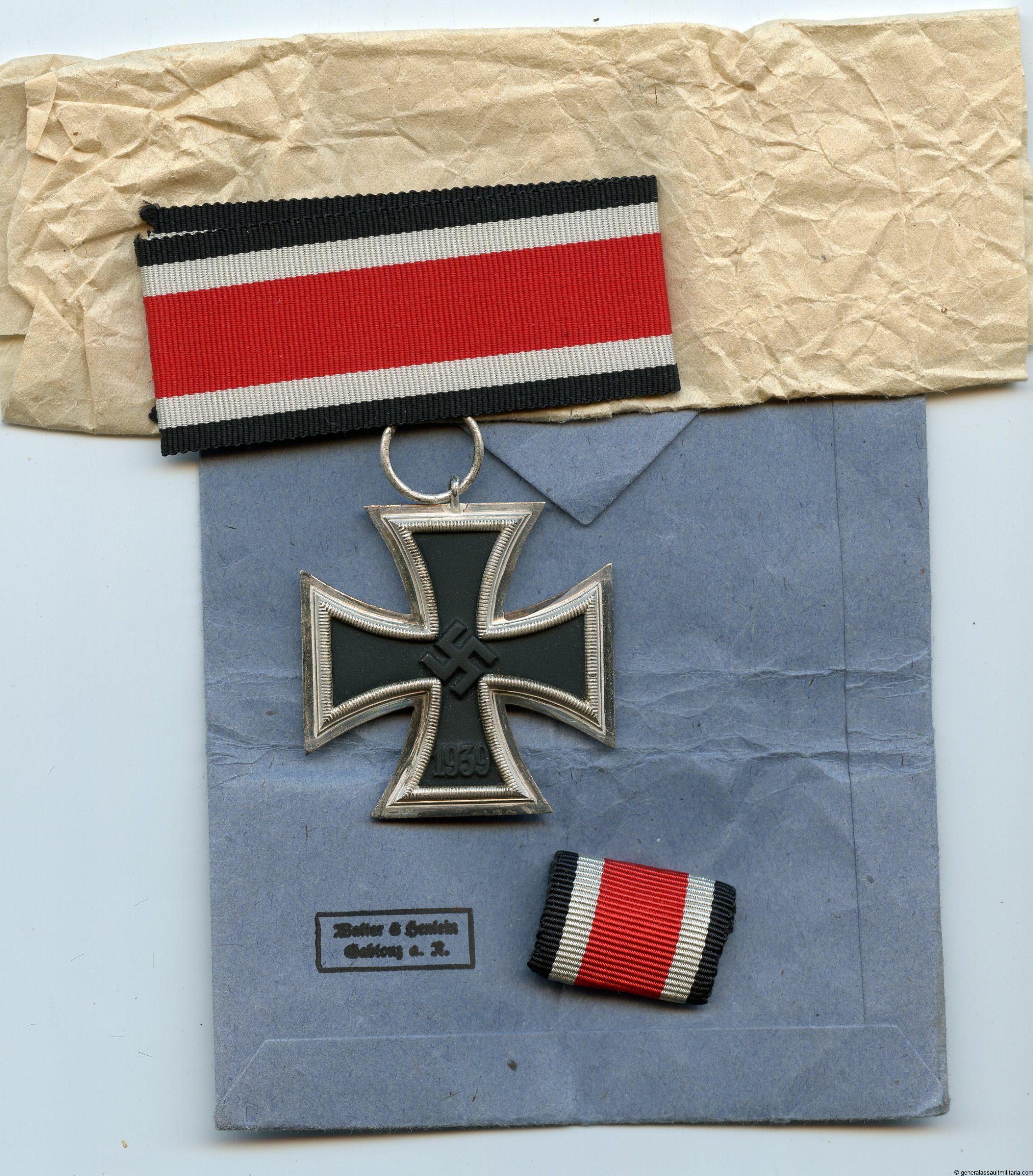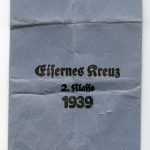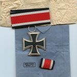 Iron cross second class + Packet – Walter & Henlein, Gablonz. Three piece construction Ek2 with W&H frame and core in very good condition, unmarked example as is always the case with W&H ek2. Comes with matching blue Walter & Henlein marked packet in very good condition with still a nice bright color. Shows some cracks and vault lines but remains tight. Complete set with packing paper, ek2, ribbon, ‘Feldspange’ and packet.