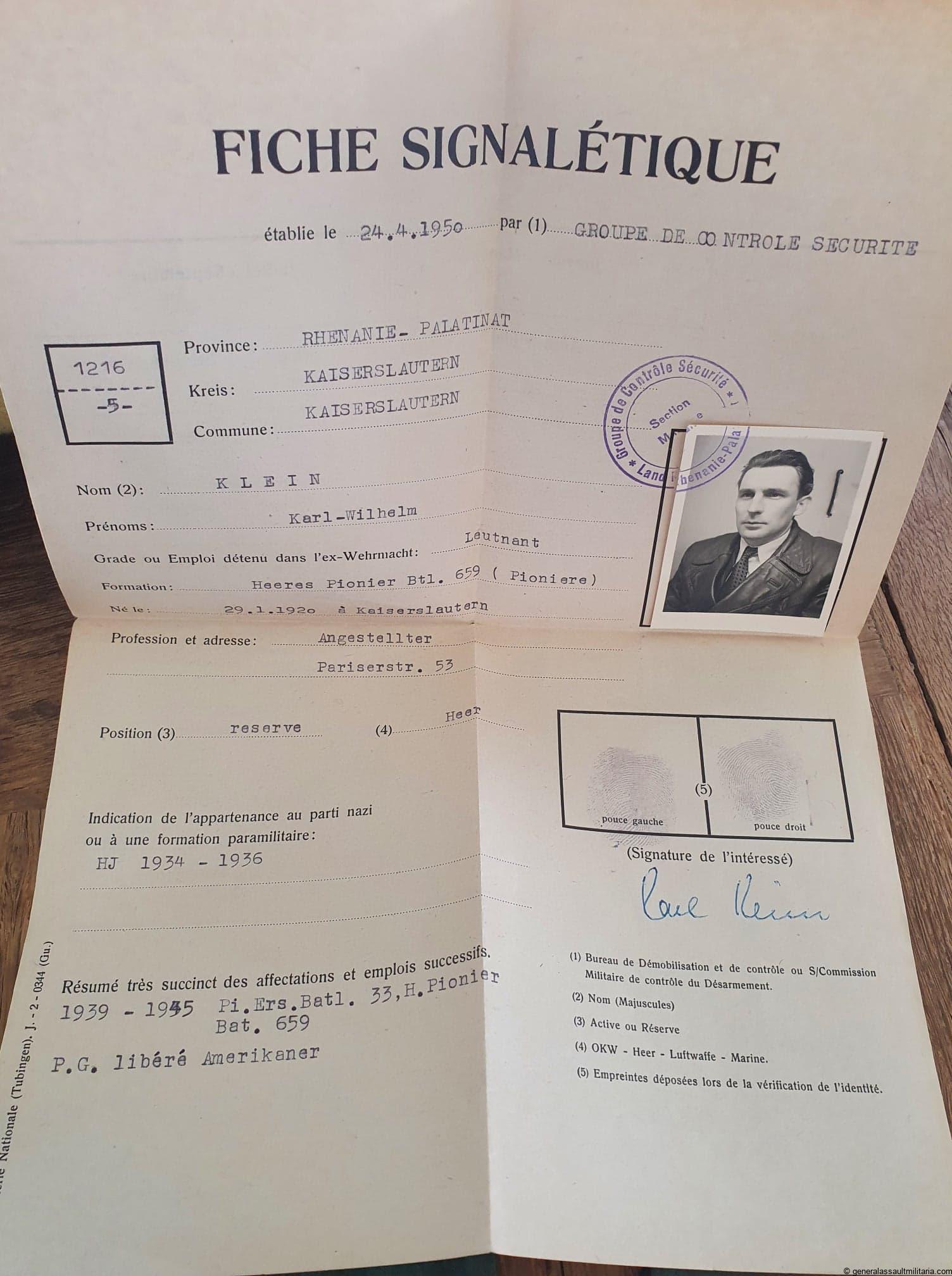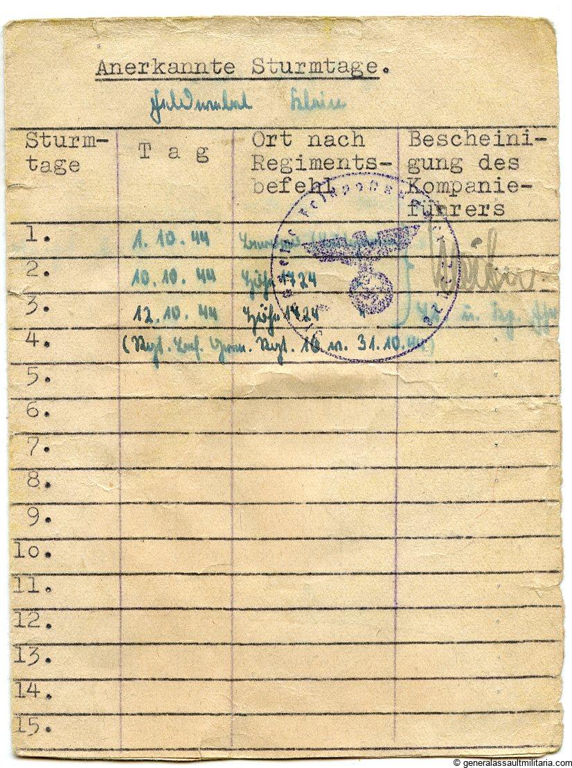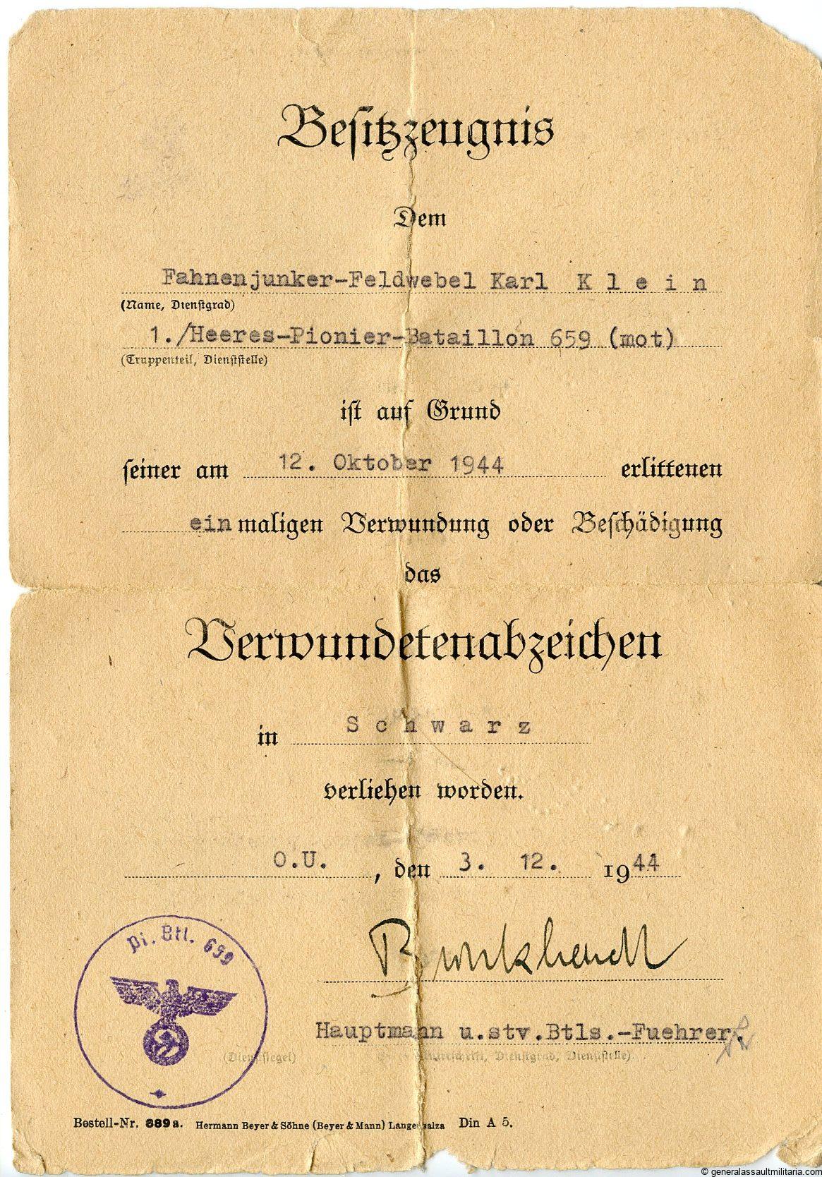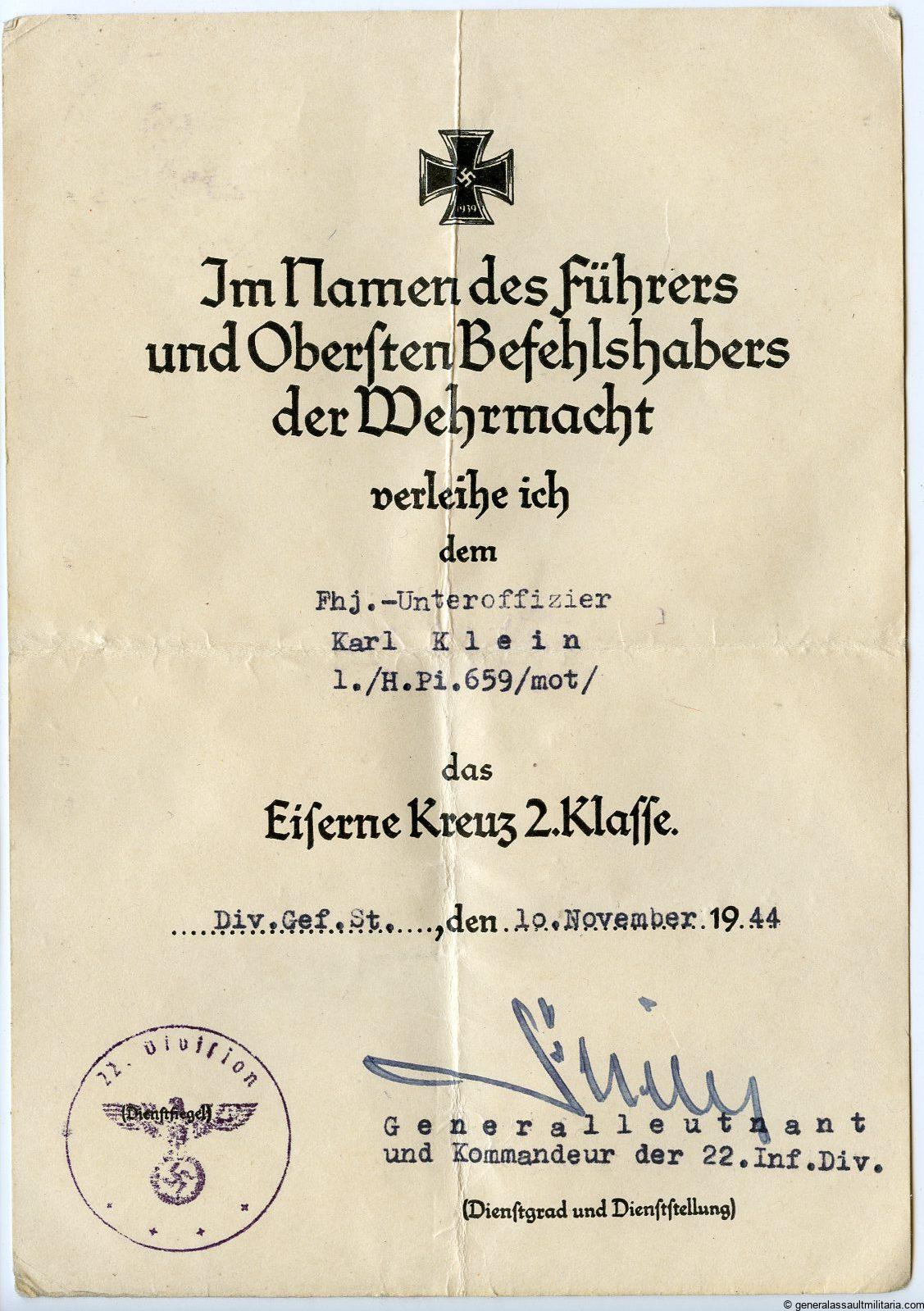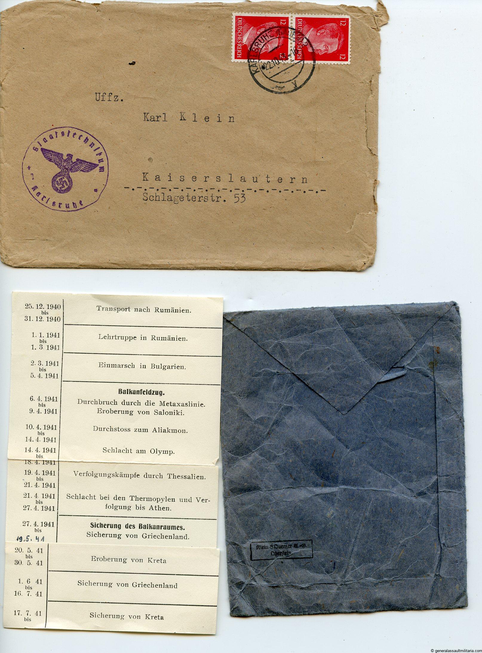 Karl Klein joined the Wehrmacht in 1938 and was on duty till the end of the war. Klein was with the Heeres-Pionier-Bataillon 659 and was involved in the campaign in France, Romania, Bulgaria, Greece, Crete, uprising in Serbia-Croatia and fortifying this area. Klein his unit spent some time on the Crete to remove explosives and forty the defensives after it was taken. The unit stayed in the southern area till the end of the war and Klein got many promotions and some schooling during the years. Klein got is award during the battles to relieve the 21 mountain division in the Balkans and the 22 luftlande-Division was successful in doing so.