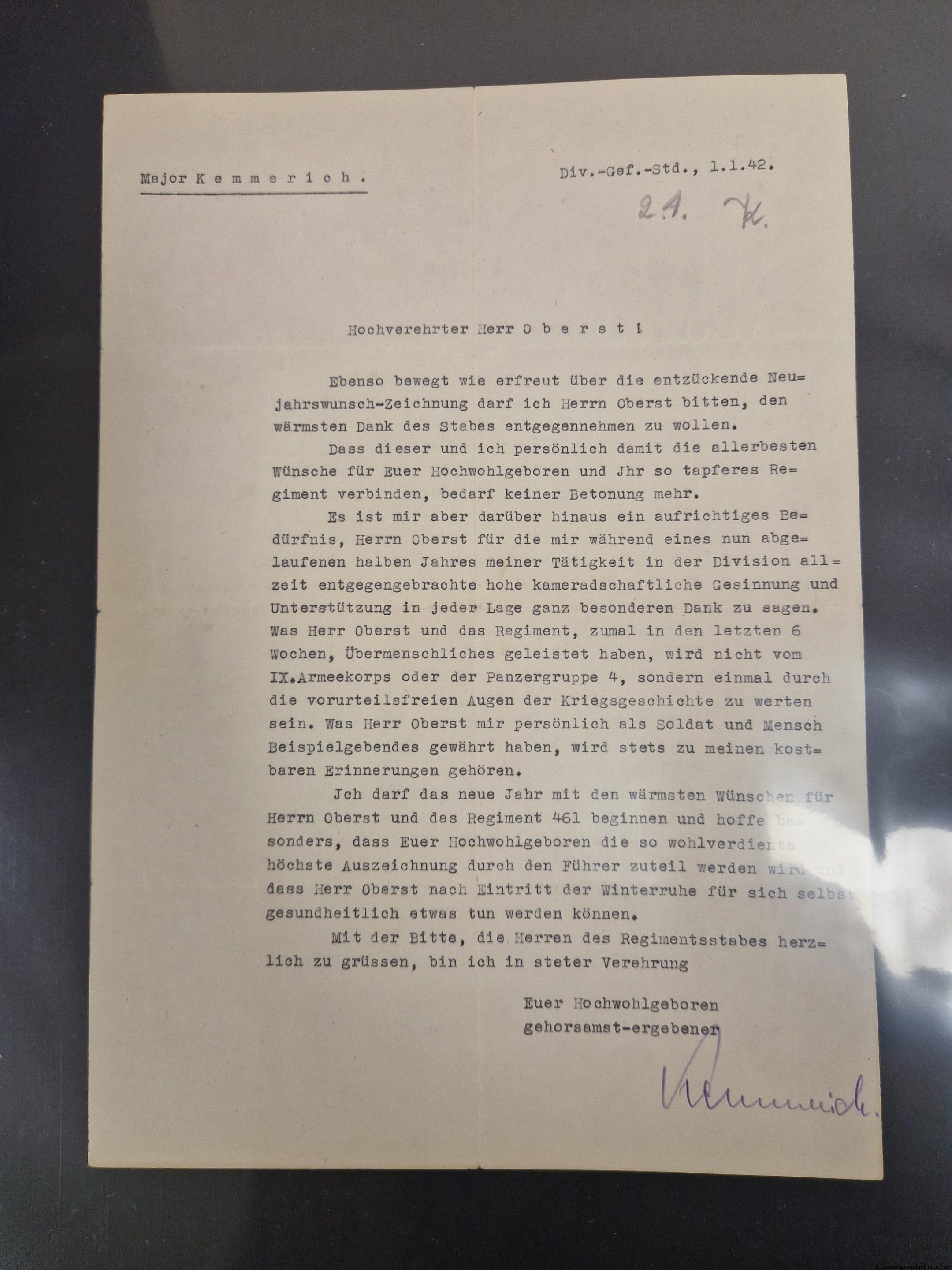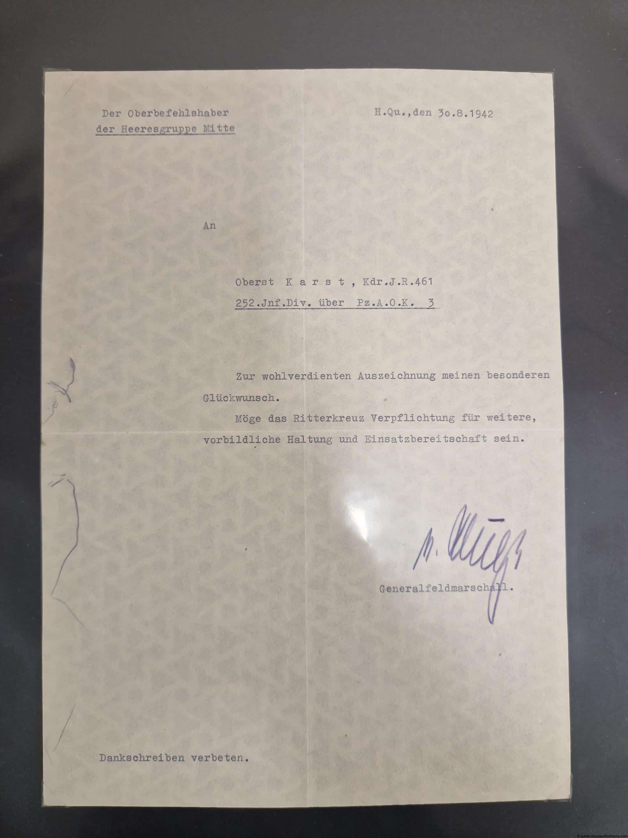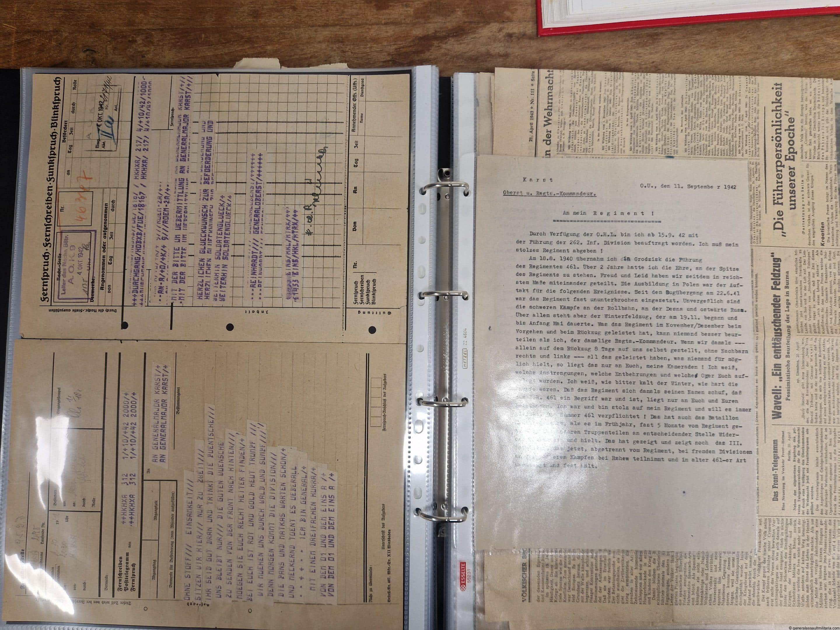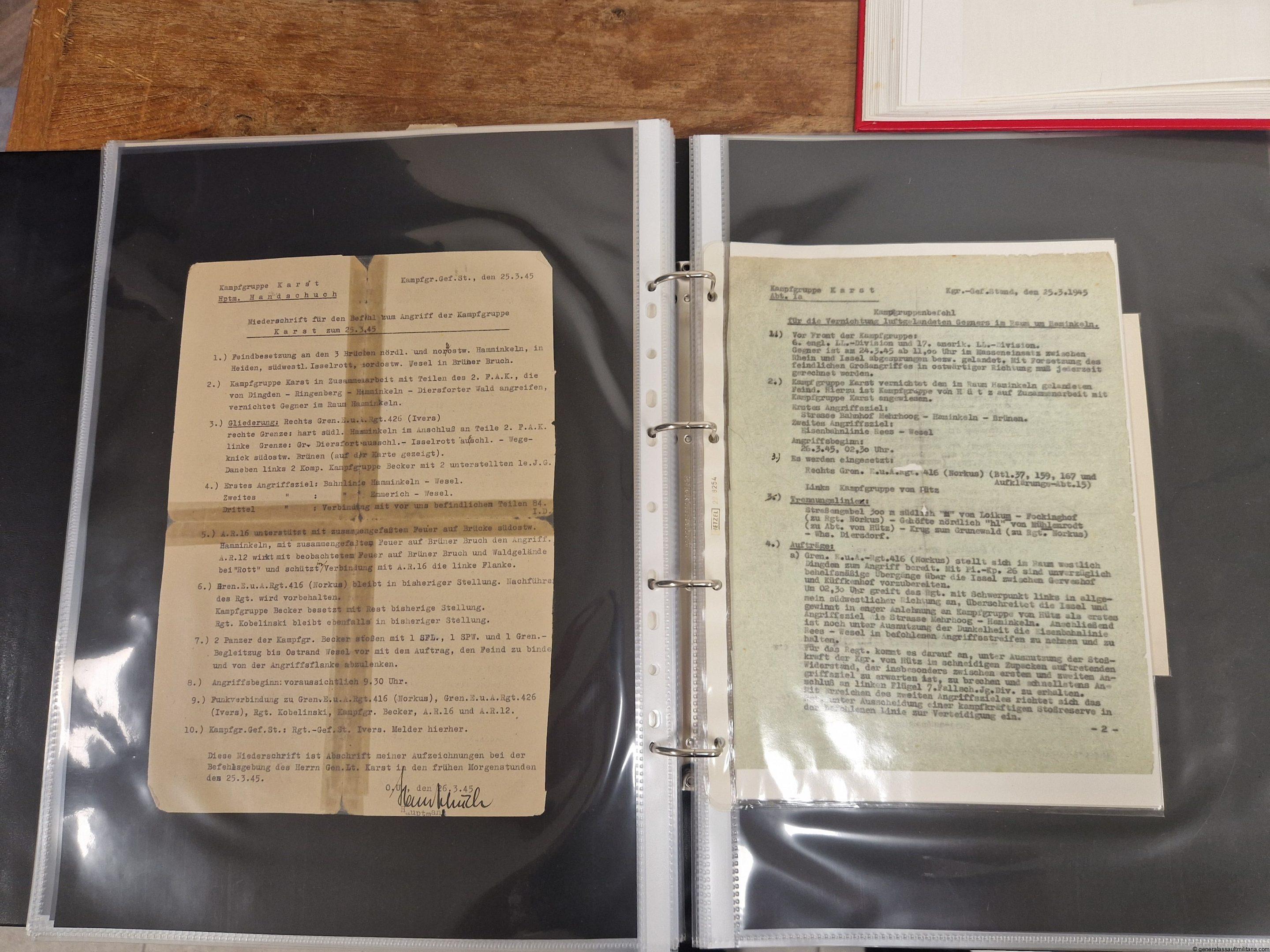 – Numerous original wartime documents and correspondence, including letters and telegrams from high-ranking officers such as Generalfeldmarschall Günther von Kluge, Generaloberst Reinhardt, and others.