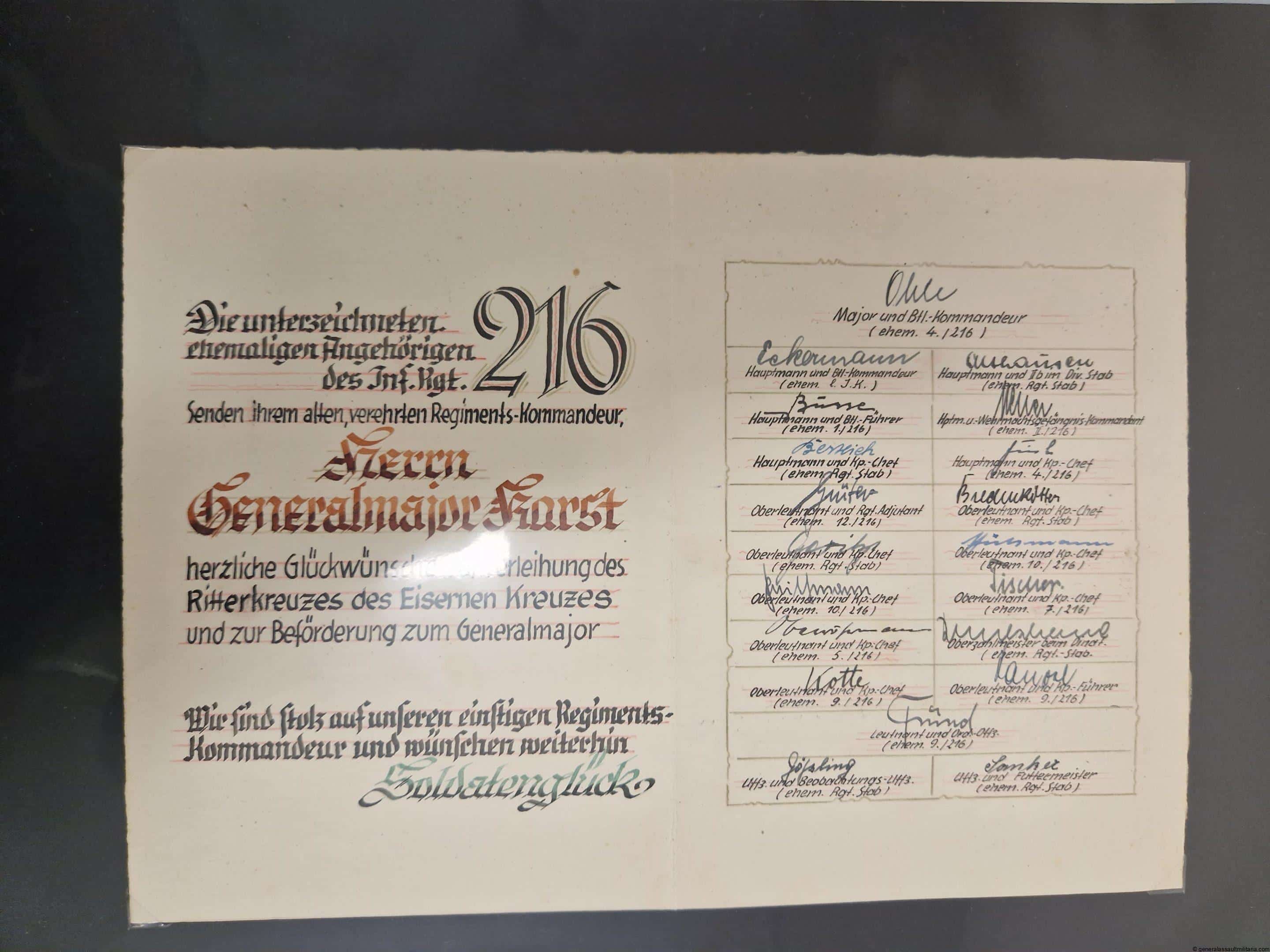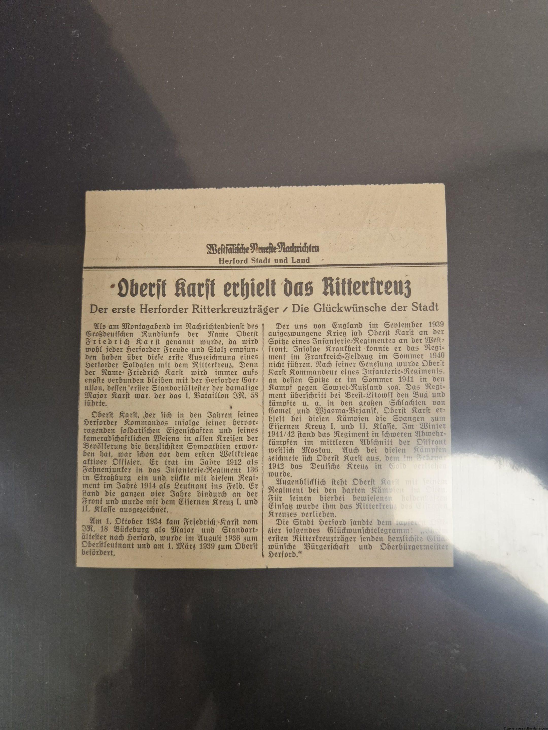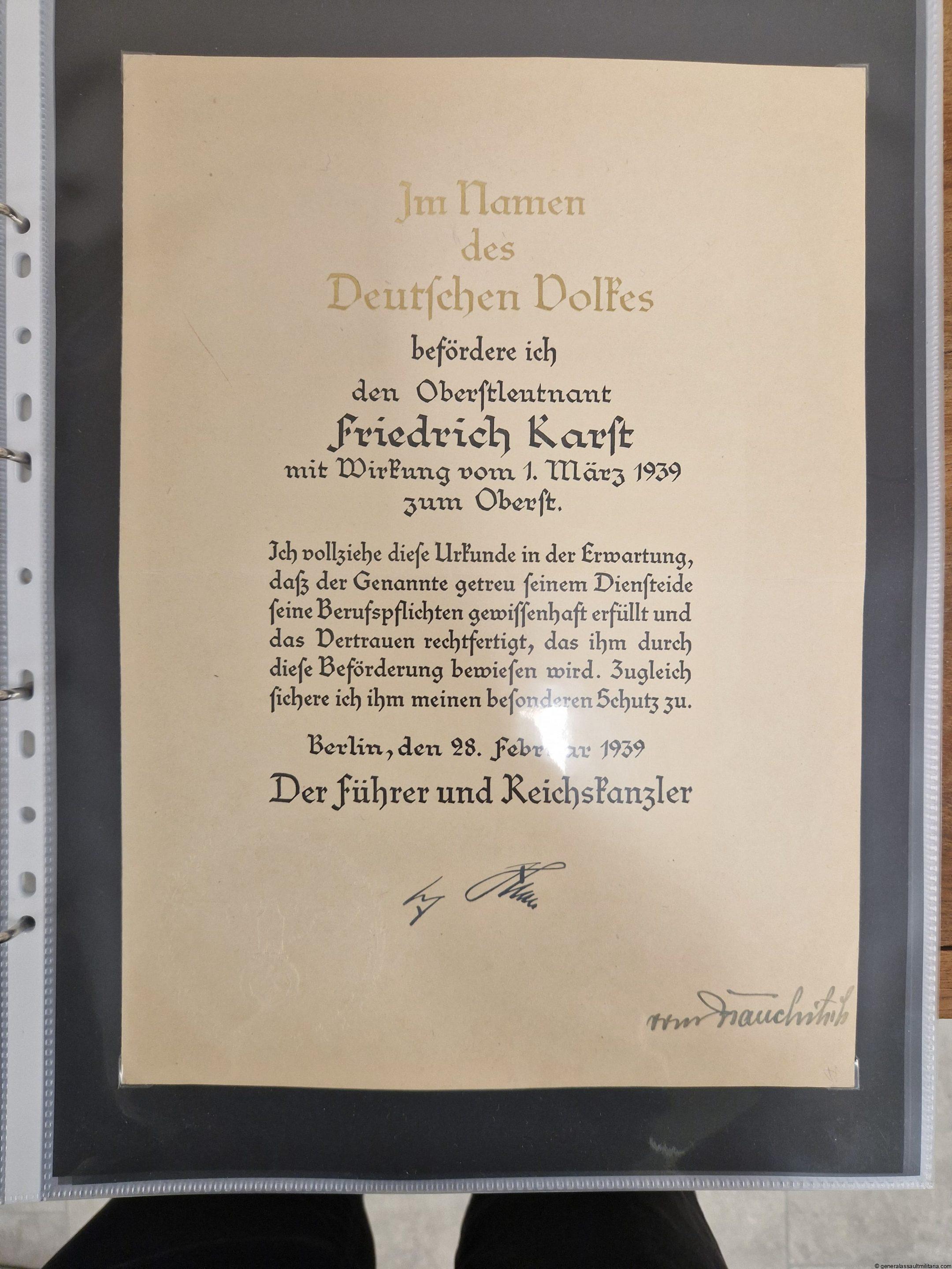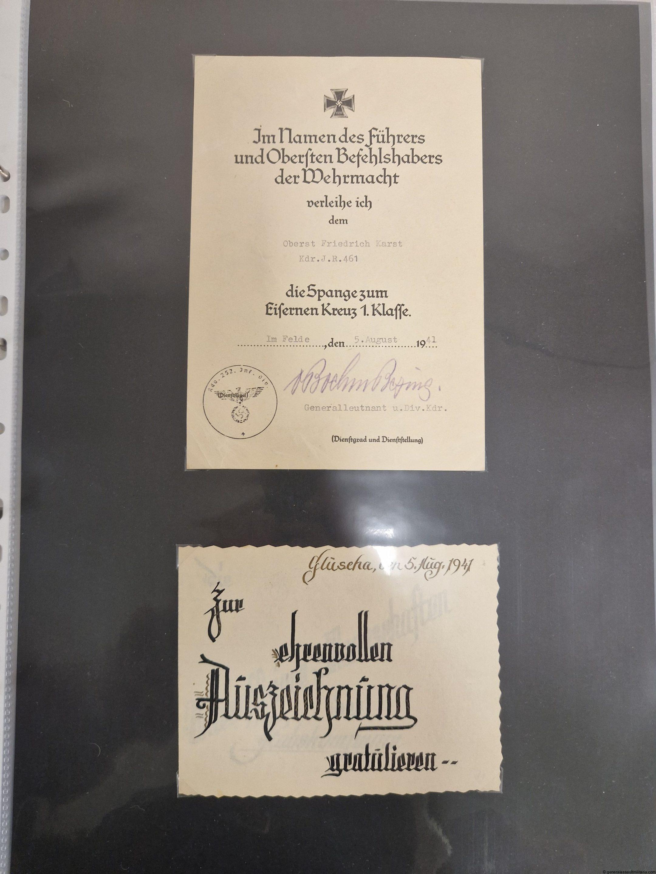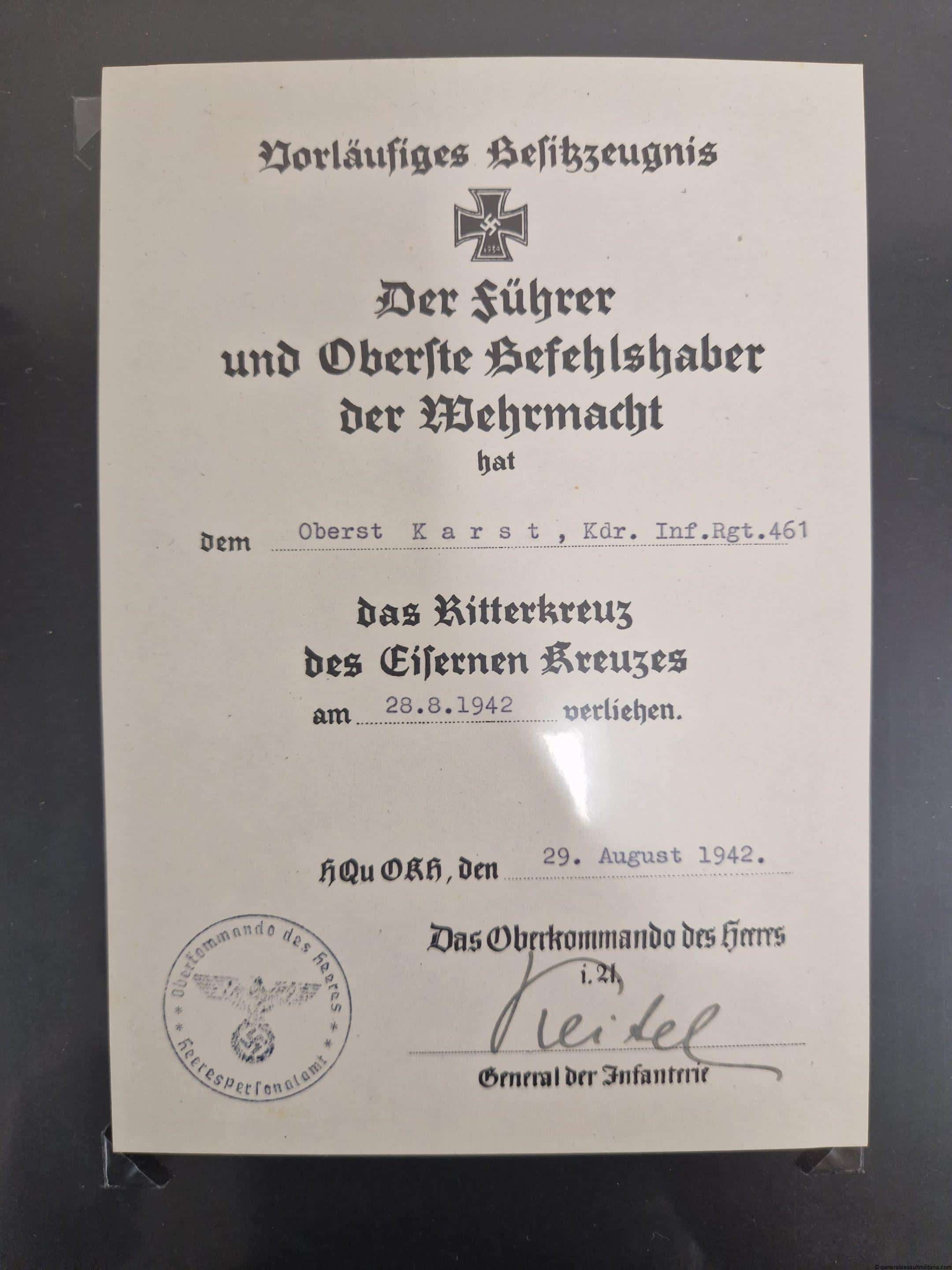 Very large and historically important grouping to Generalleutnant Friedrich Karst (1893–1975), who was awarded the Knight’s Cross on 28 August 1942 as commander of Infantry Regiment 461 for his leadership on the Eastern Front. At the end of the war, Karst commanded “Kampfgruppe Karst” near Haminkeln, just across the Dutch border, where his unit fought against US paratroopers during Operation Varsity. He later commanded the 262nd Infantry Division.