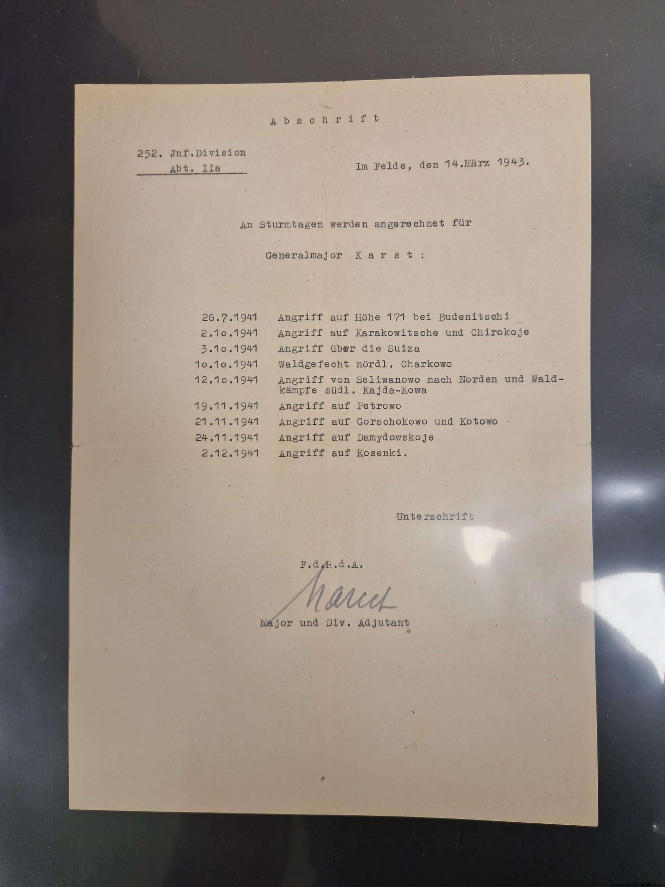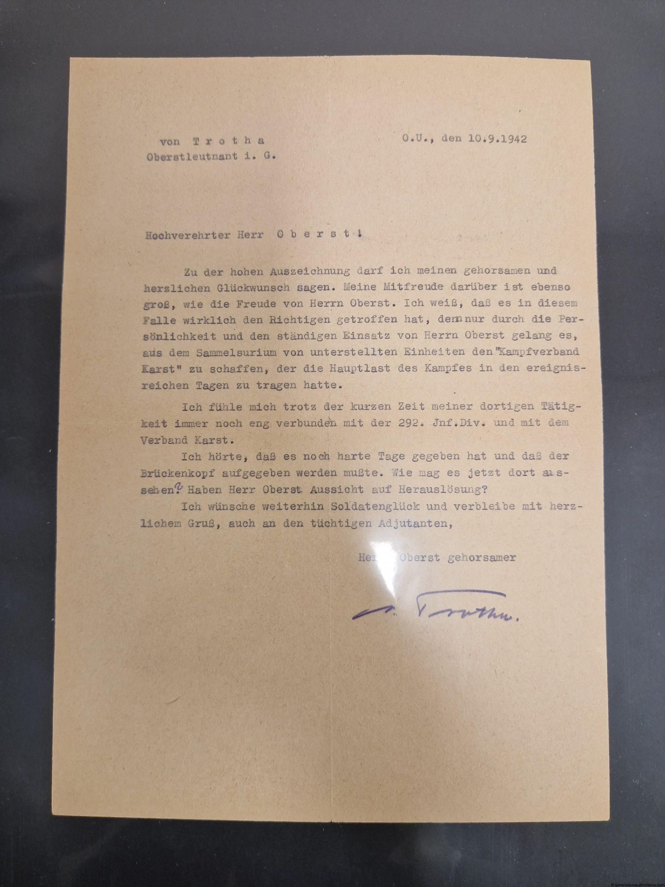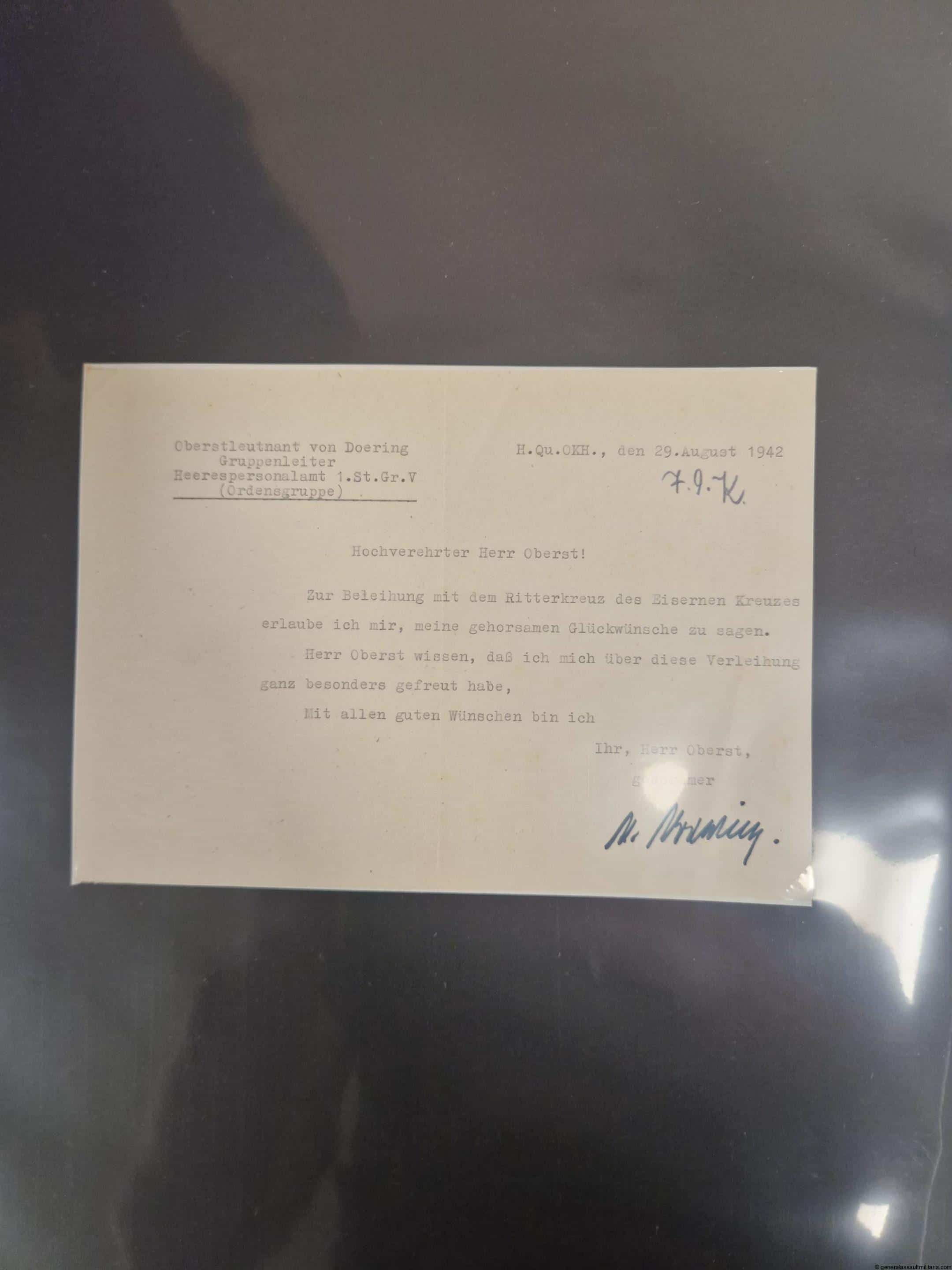 – Preliminary award document for the Knight’s Cross (28.08.1942), signed by General of Infantry Bodewin Keitel.