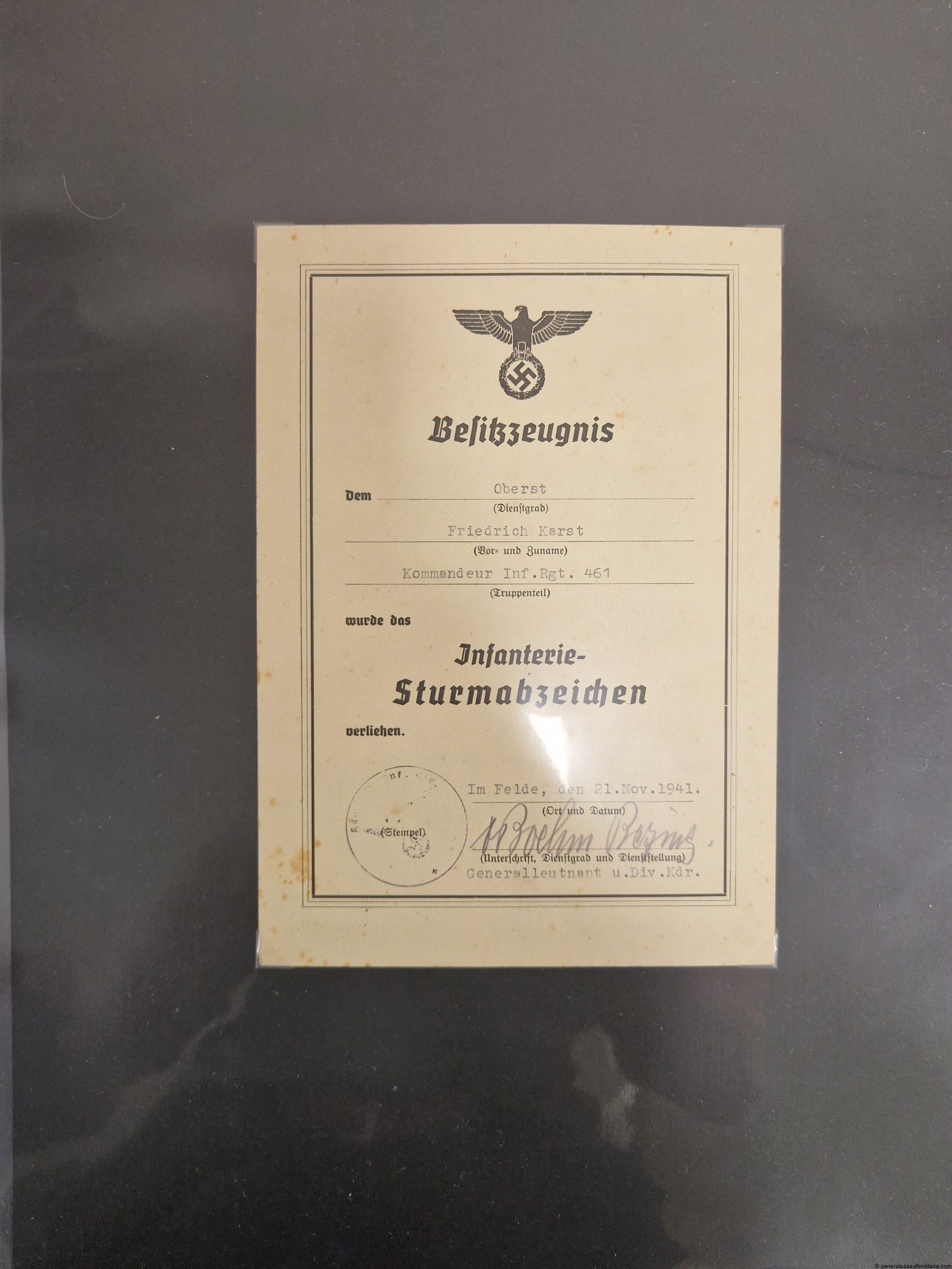 – Award documents for the Clasp to the Iron Cross 1st Class (05.08.1941) and Infantry Assault Badge (21.11.1941).