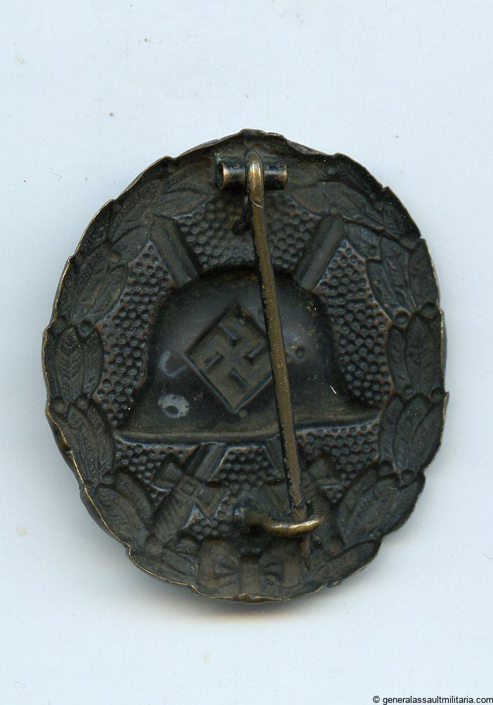First pattern wound badge in black – Unknown maker. Early tombac wound badge with 1918 helmet design and swastika added to the design. Remains in lightly worn condition and shows most of the black finish still on the badge. Beautiful wear pattern with the tombac base material exposed on the high spots. Quality badge.