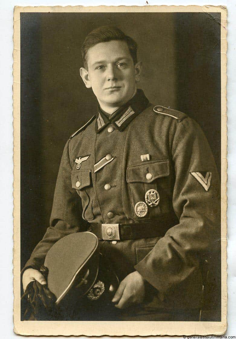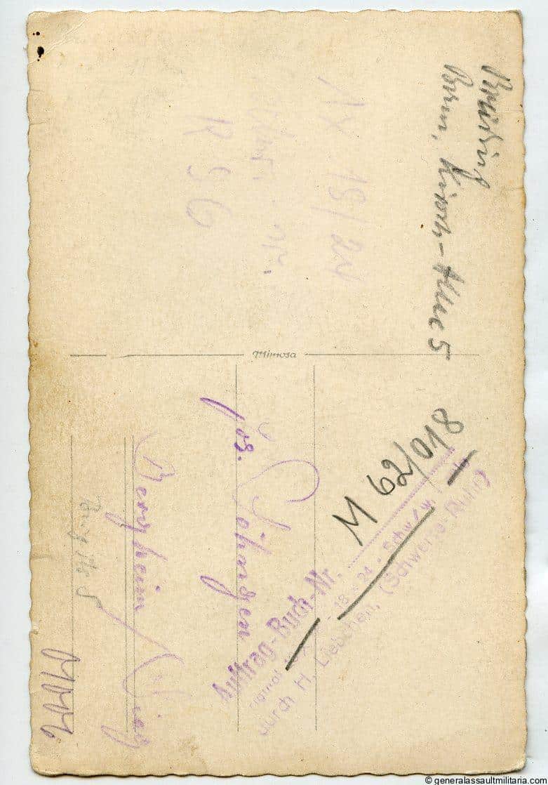 Full Heer portrait with GAB and WBS in wear. Postcard size, very sharp, Mimosa portrait paper, text on the reverse and addressed to someone in Bergheim. Excellent full portrait, piping is most likely infantry.