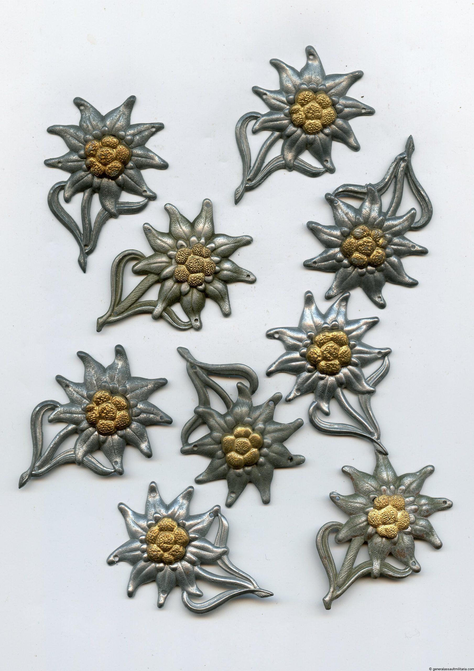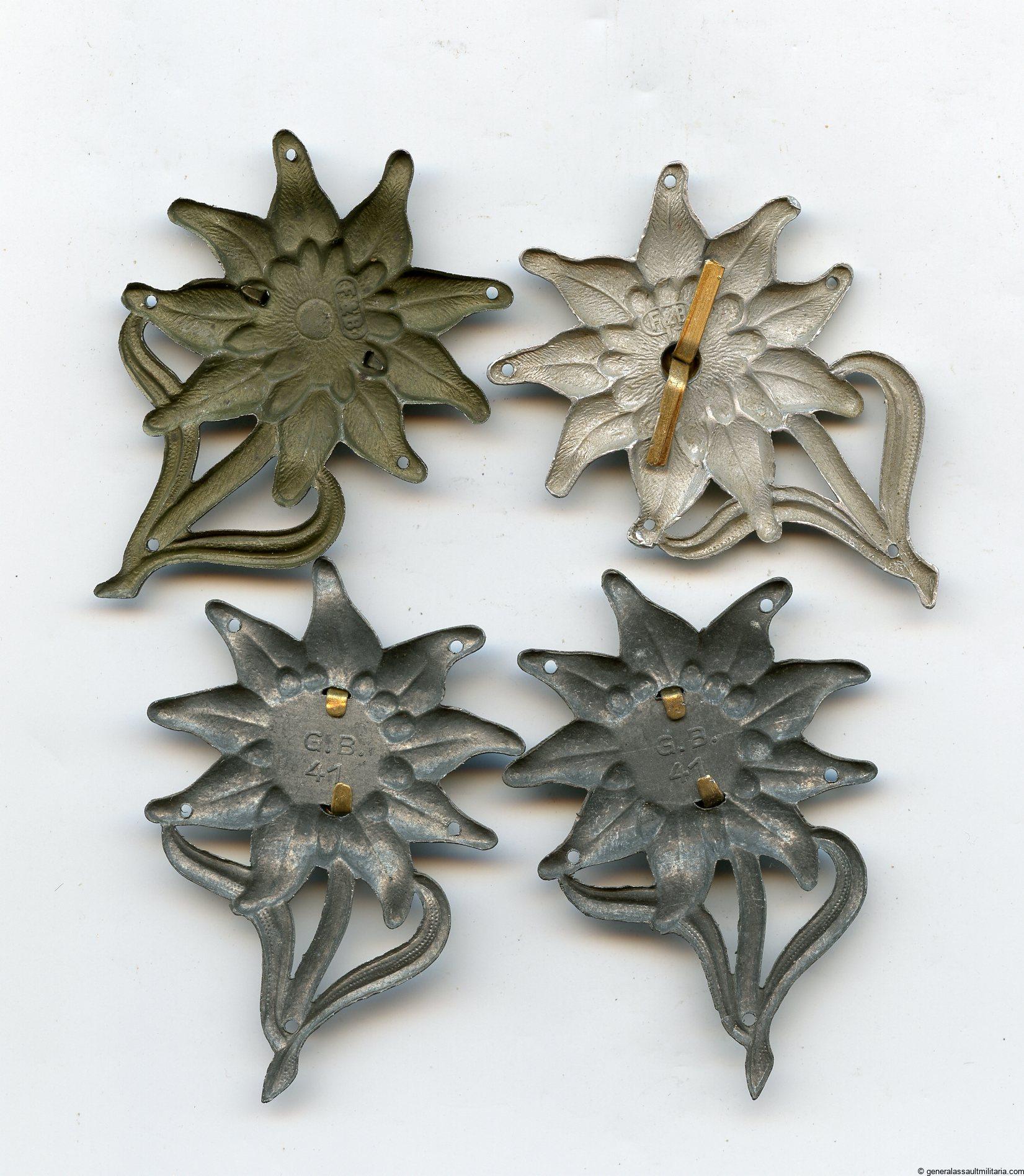 Gebirgsjäger Edelweiss cap insignia. Iron and aluminum variants in mostly unworn condition. Stamped with a variety of maker marks including F&B and G.B.(41,42,44). All remain in good condition.