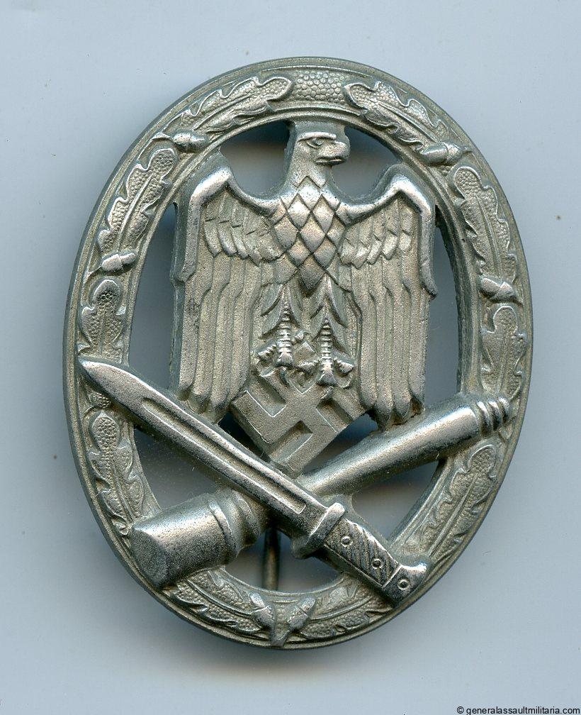 General assault badge – Assmann & Sohn, Lüdenscheid. Early to mid war hollow steel construction ‘Allgemeines Sturmabzeichen’ with Assmann makers mark on the reverse of the swastika. Remains in near mint condition with no wear and full finish remaining. This variant features no cut outs under the swastika and is the only maker to have produced a steel GAB. Sought after badge!