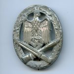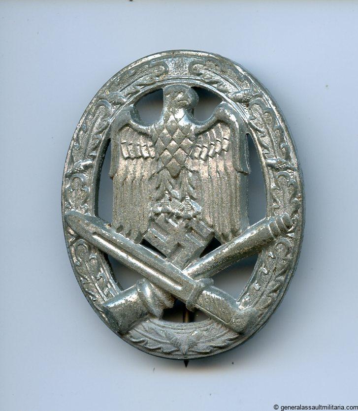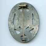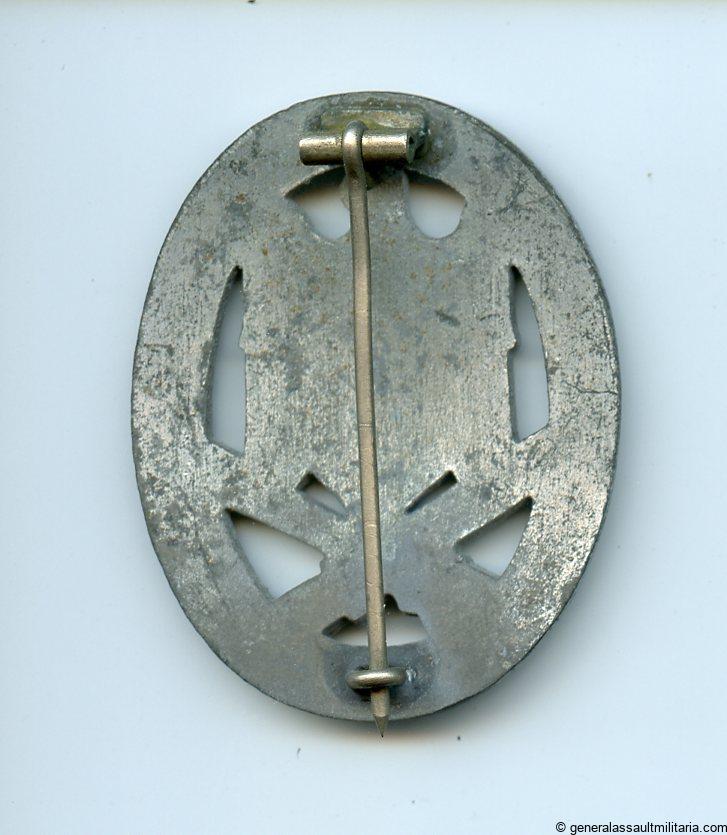General assault badge – Berg & Nolte, Lüdenscheid. Heavy zinc GAB with nickel-silver setup. Heavily worn condition with a good amount of its silver chrome finish remaining. The badge is slightly vaulted as is normally the case with the B&NL GABs. Slight surface oxidation near the bottom side of the wreath and catch, but this hasn’t really affected the badge much. No damage or repairs.
