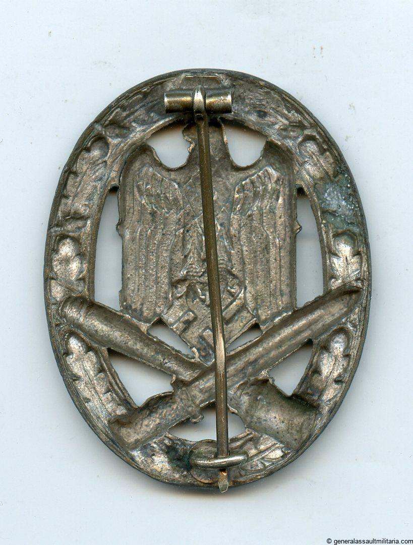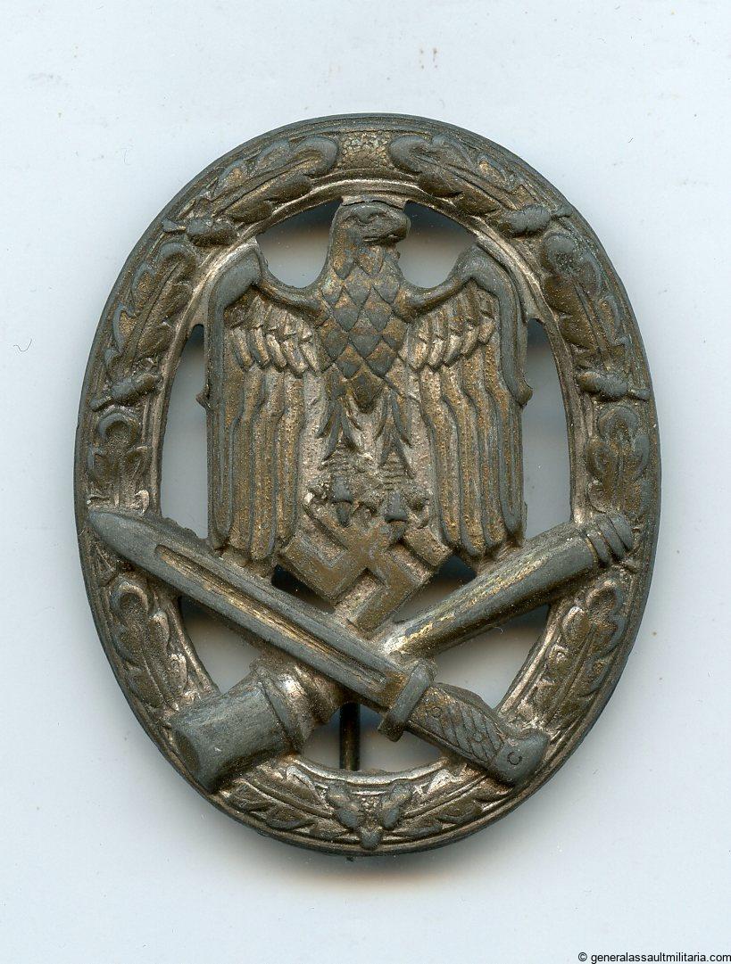 General assault badge – C.E. Juncker, Berlin. Early hollow zinc GAB with Juncker design and copper/tombac coated surface with silver finish on top. Remains in well worn condition with most of the finish and coating worn down on the front. Exposing some the base layer, giving it a bronze appearance in some areas.