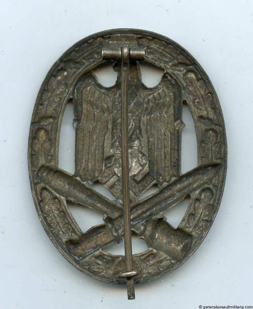 General assault badge – C.E.Juncker, Berlin. Early to mid war hollow zinc Juncker design badge. Remains in lightly worn condition with patinated finish, but still most of it intact. Uncommon badge with great details and design.